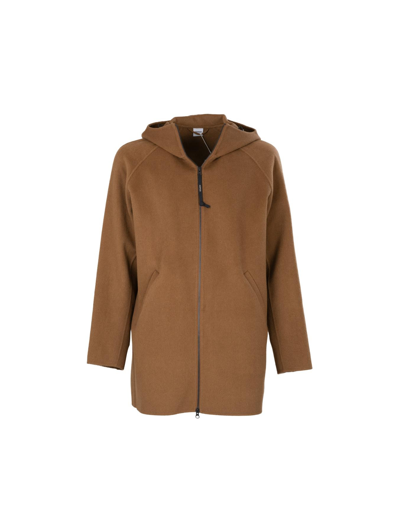 Giubbotto dalla linea dritta realizzato in morbido e caldo tessuto double di lana. Il modello presenta un cappuccio ed e dotato di una chiusura frontale con zip a doppio cursore e di due tasche oblique a filetto. Completa il capo il tirazip logato. Vestiblita regolare.