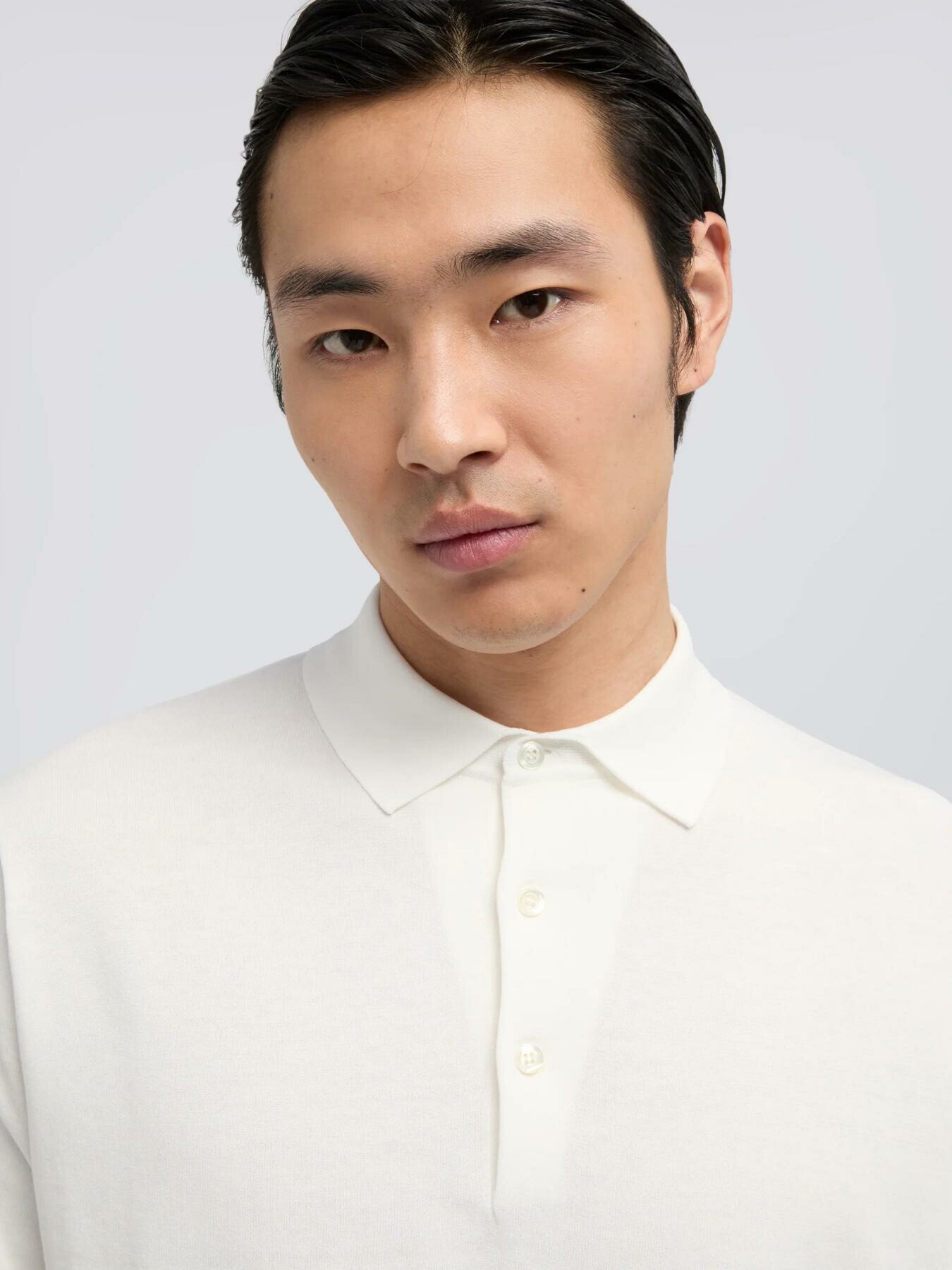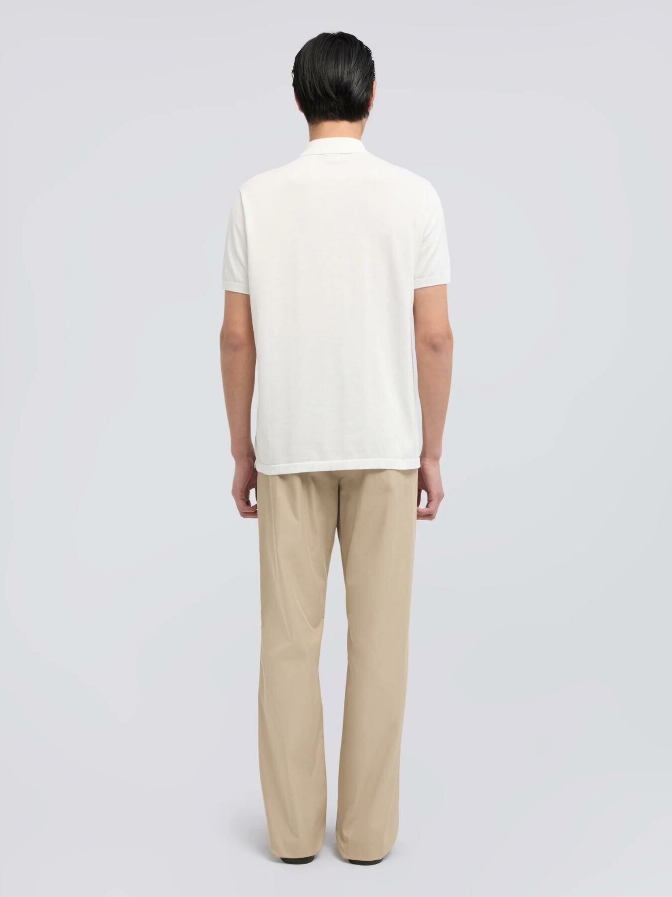 Polo a maniche corte in puro cotone rasato finezza 16. Riga a contrasto sul colletto e bottoni in madreperla. Spacchetti laterali. Vestibilita regolare.