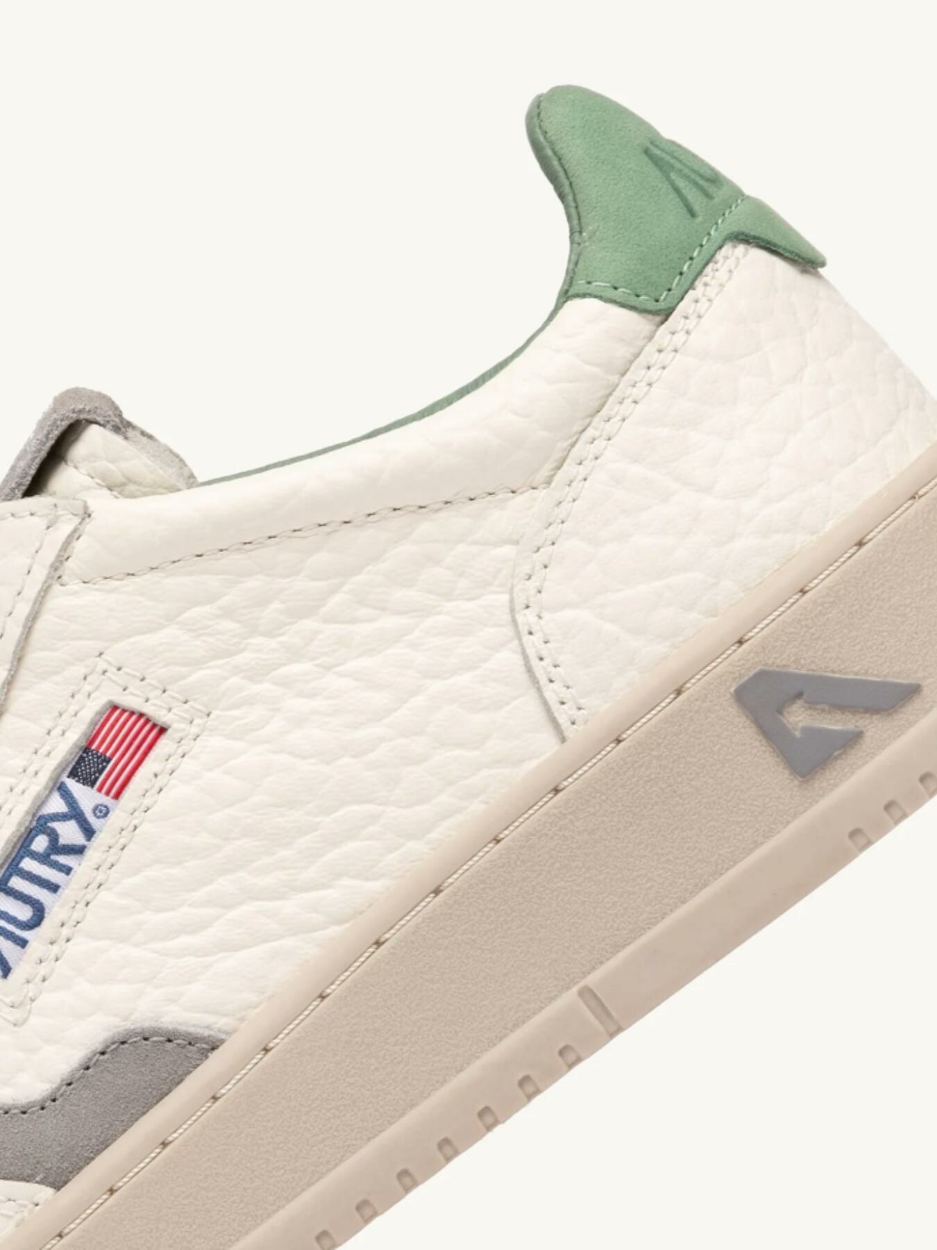 Il dettaglio logato in nabuk verde sul tallone, l’inserto laterale con logo Autry jacquard e la suola leggermente piรน scura personalizzano il look.