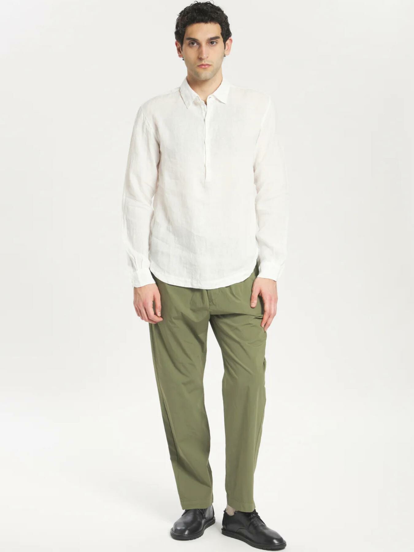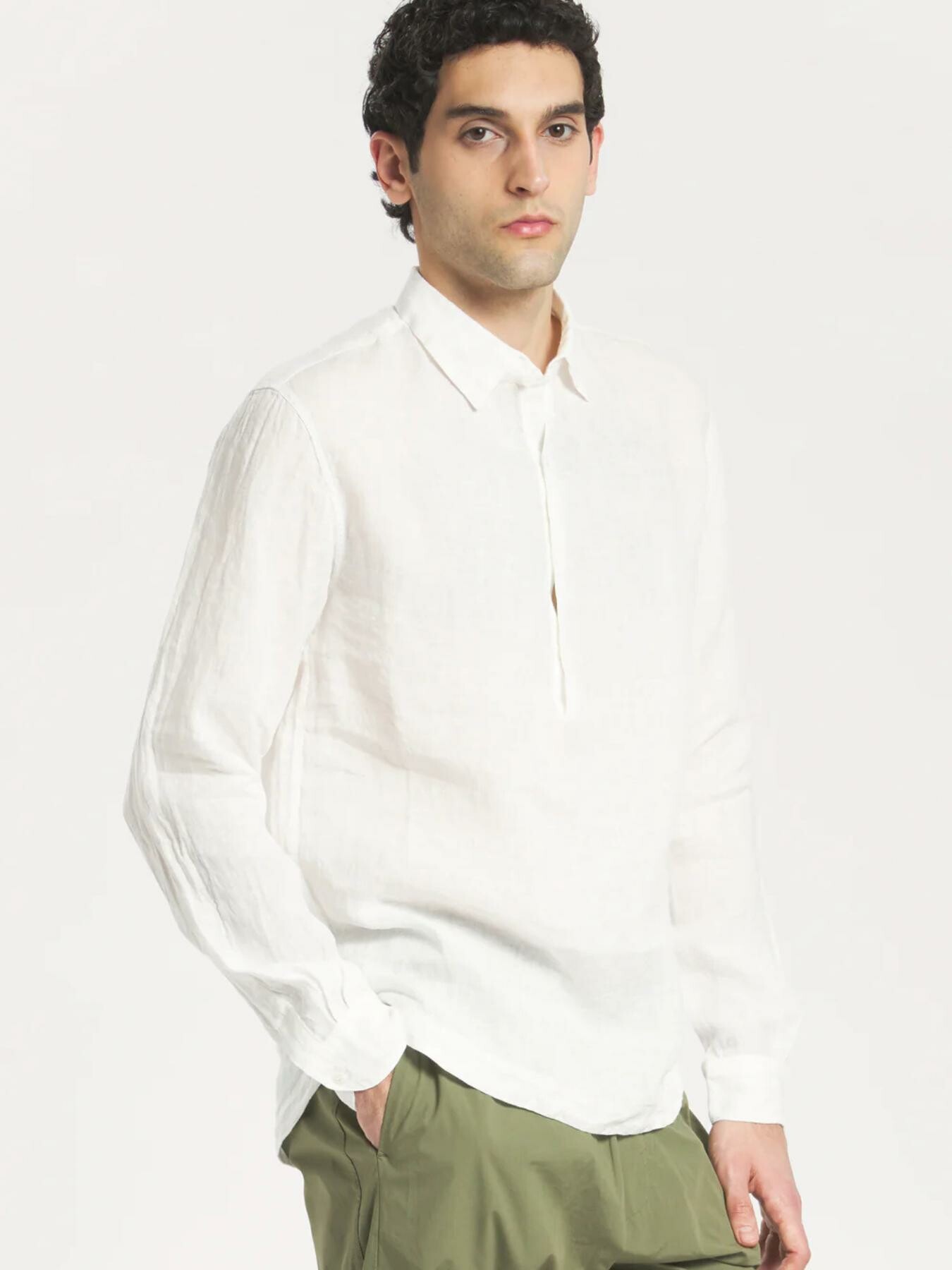 Il lino leggero e morbido, di un bianco candido, conferisce a questa versatile camicia un look rilassato ma vivace. La silhouette pulita e sobria รจ impreziosita da una mezza abbottonatura con bottoni, mentre l’orlo posteriore leggermente piรน lungo aggiunge un tocco moderno. Composizione: 100% lino