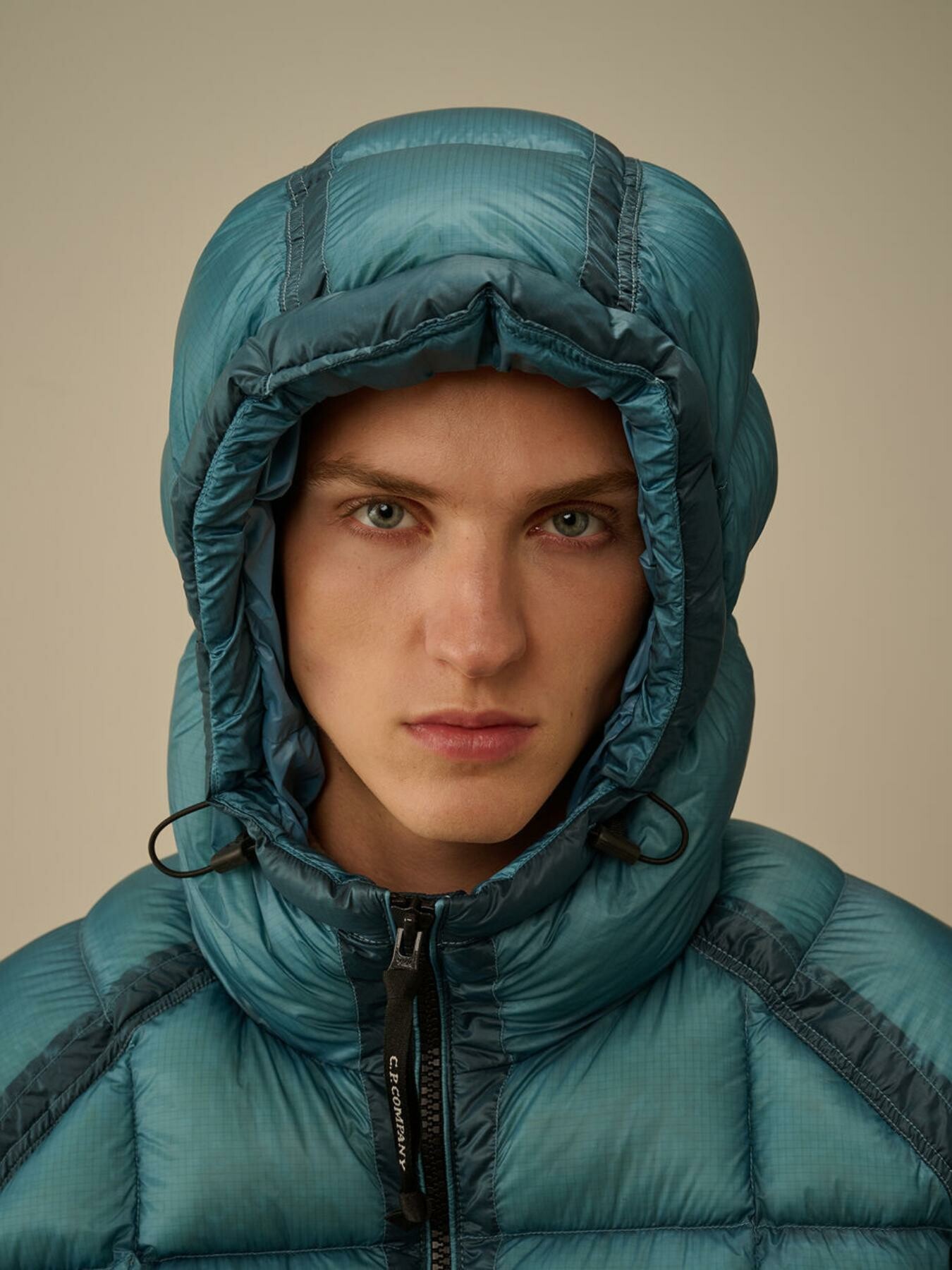 Piumino con cappuccio realizzato in D.D. Shell, un nylon micro-ripstop opaco 7 denari. La leggerezza e la trasparenza del materiale mette in risalto la costruzione, mentre il processo di iniezione a piuma diretta assicura un isolamento ideale. Il modello presenta cappuccio regolabile, chiusura full zip a doppio cursore, tasche laterali con zip, cuciture a contrasto, polsini elasticizzati, fondo regolabile con coulisse e lโiconica Lente di C.P. Company. Regular fit.