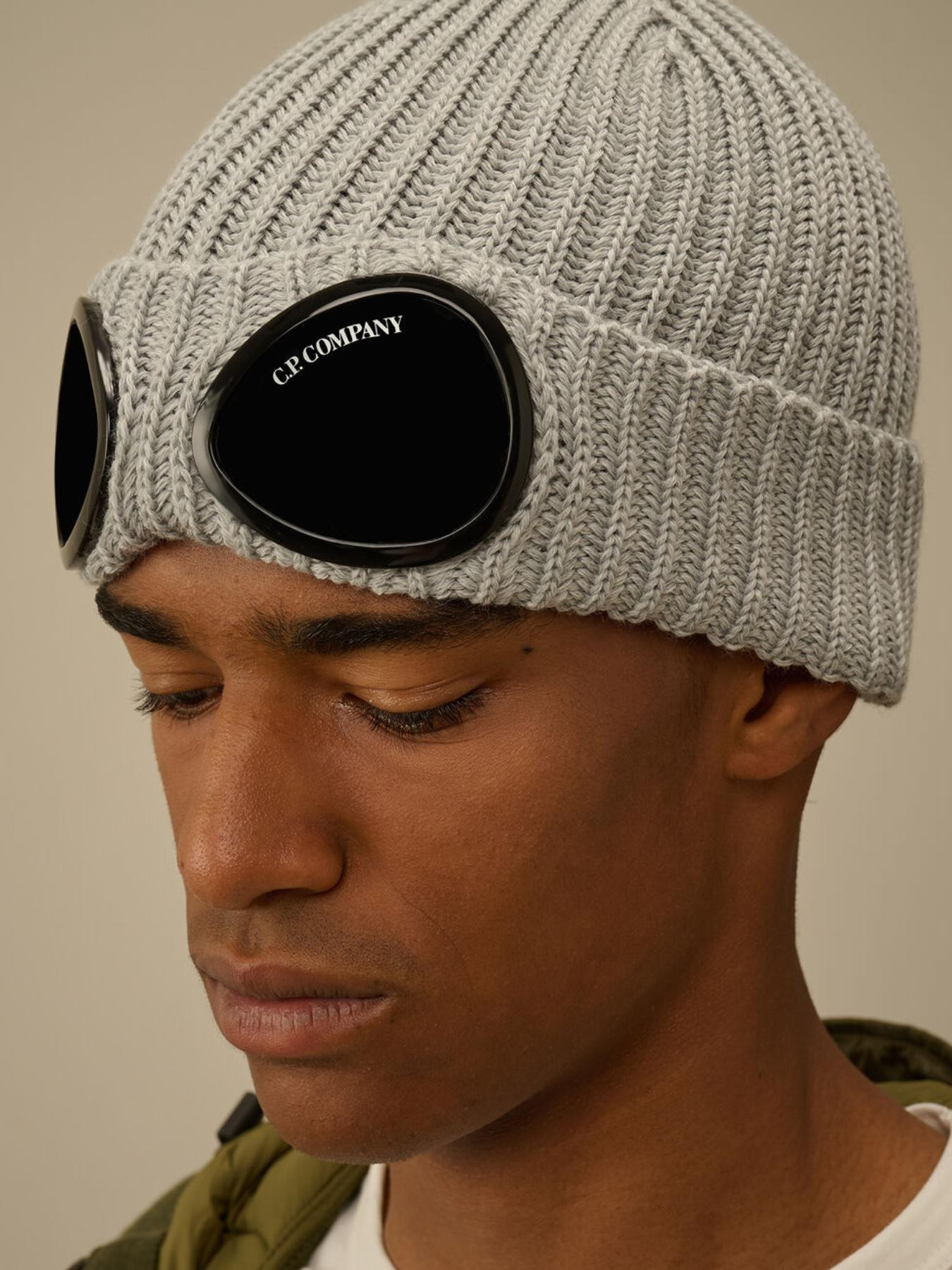 Beanie realizzato in lana merino extrafine, che garantisce morbidezza e calore. Il beanie presenta una lavorazione in maglia a costine, risvolto e le iconiche lenti Goggle di C.P. Company.