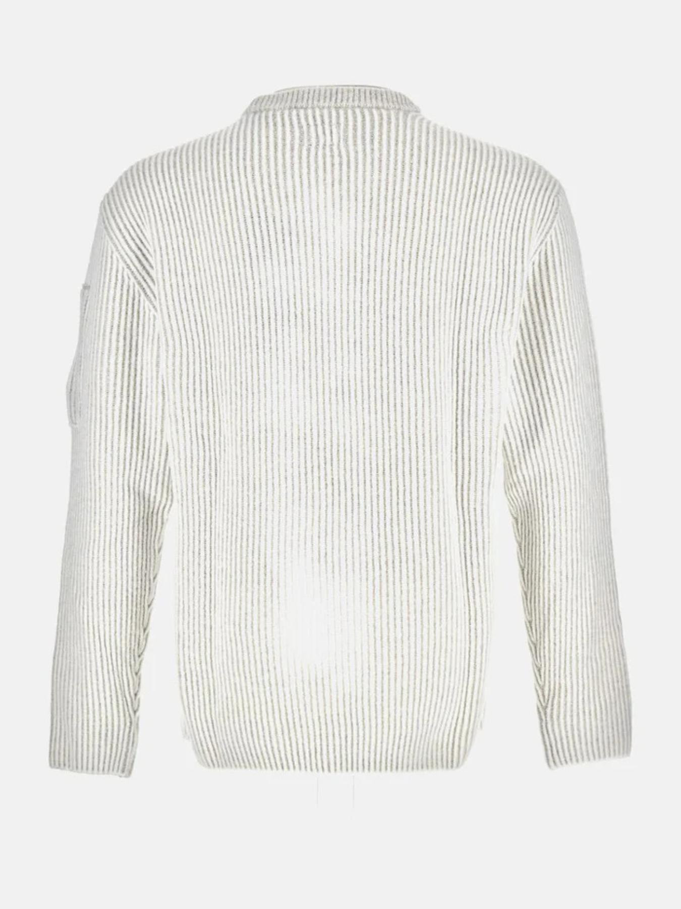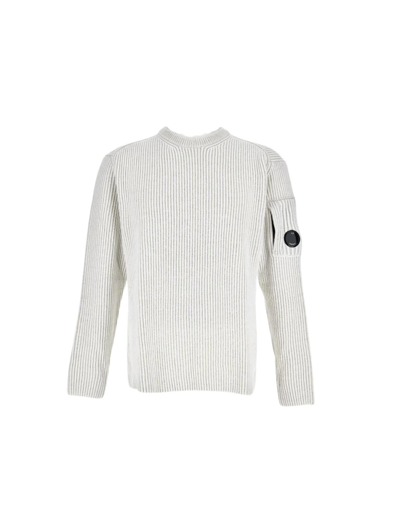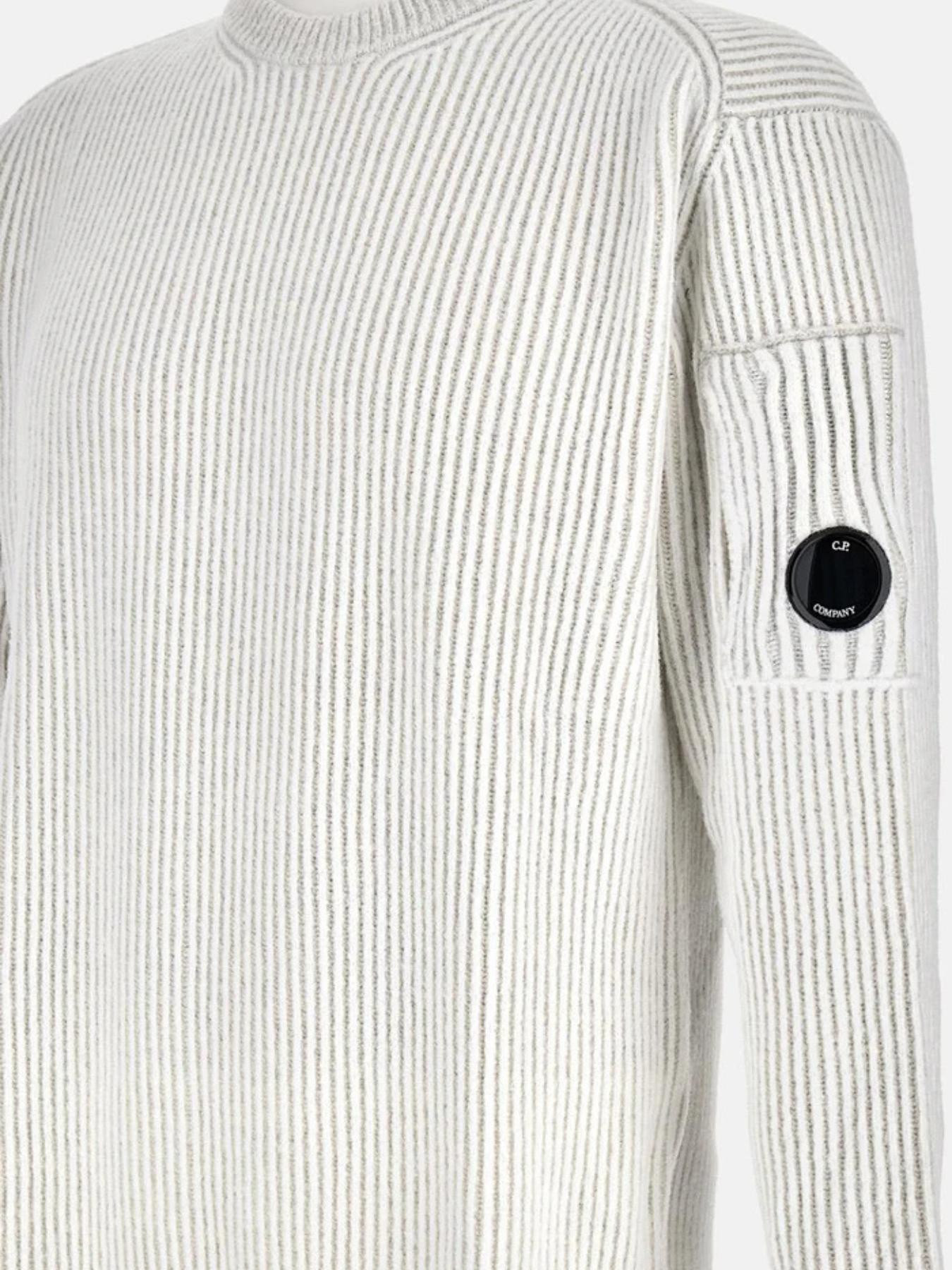 Maglione girocollo realizzata in lana vanisรฉ con ciniglia di poliestere a contrasto. Il modello รจ arricchito dallโiconica Lente di C.P. Company. Finezza 7. Regular fit.