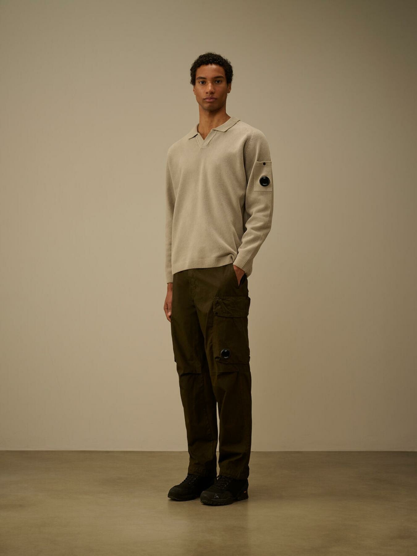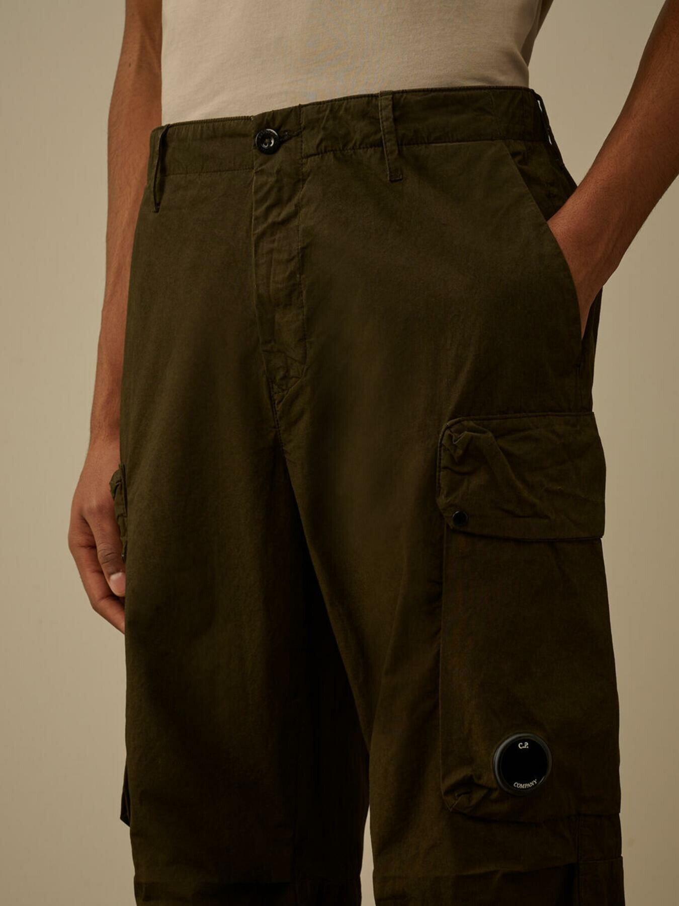 Pantaloni cargo realizzati in Micro-Reps, un tessuto di cotone ad alta densitร caratterizzato da una struttura compatta e una mano morbida. Il modello presenta chiusura con bottone e zip, passanti per cintura e tasche laterali. Dettagli funzionali includono tasche con patta e bottoni automatici con lโiconica Lente di C.P. Company, una tasca posteriore con patta e unโetichetta con logo applicata sul retro. Lโorlo regolabile con coulisse completa il design. Made in Italy. Boxy fit.