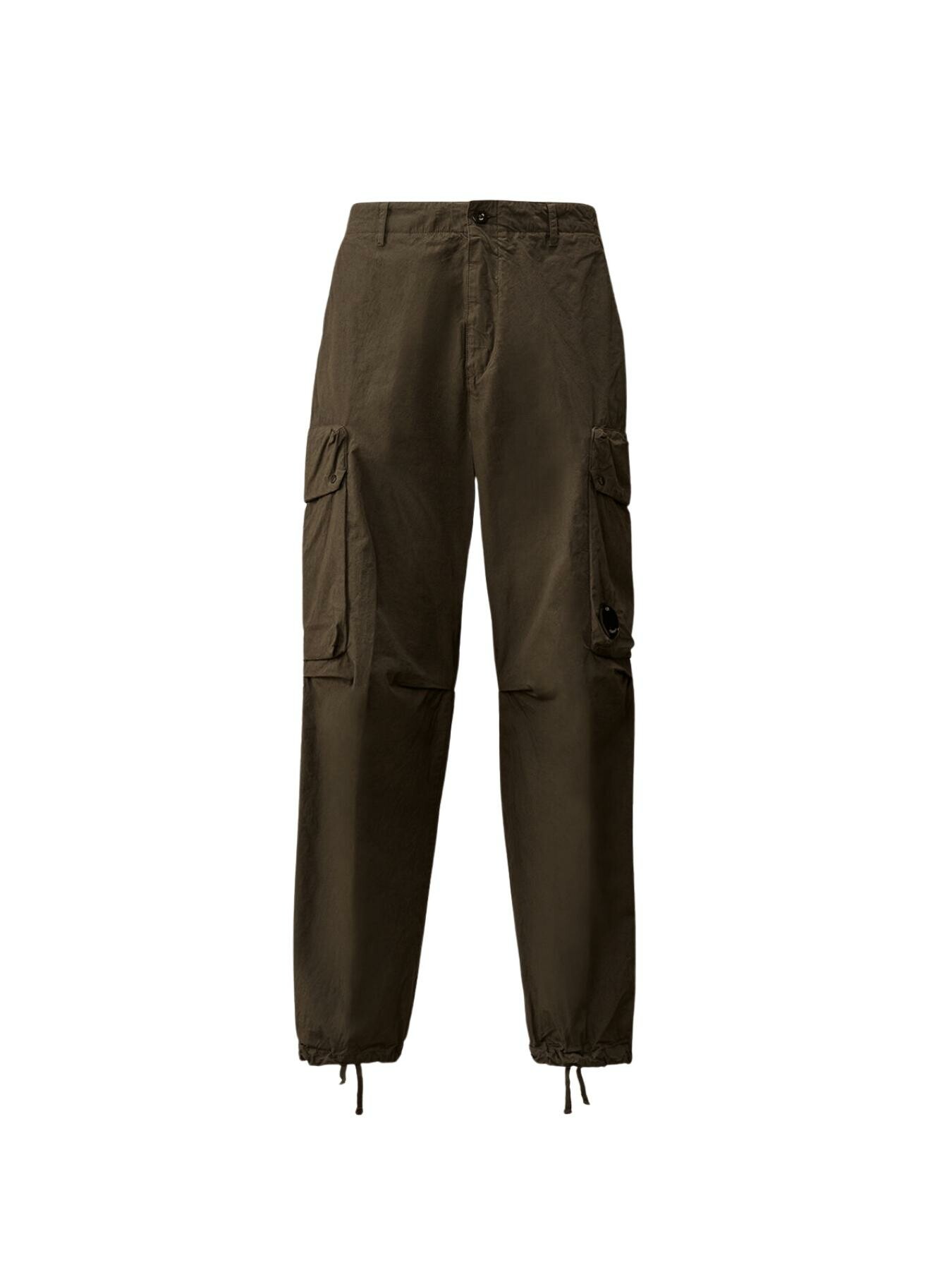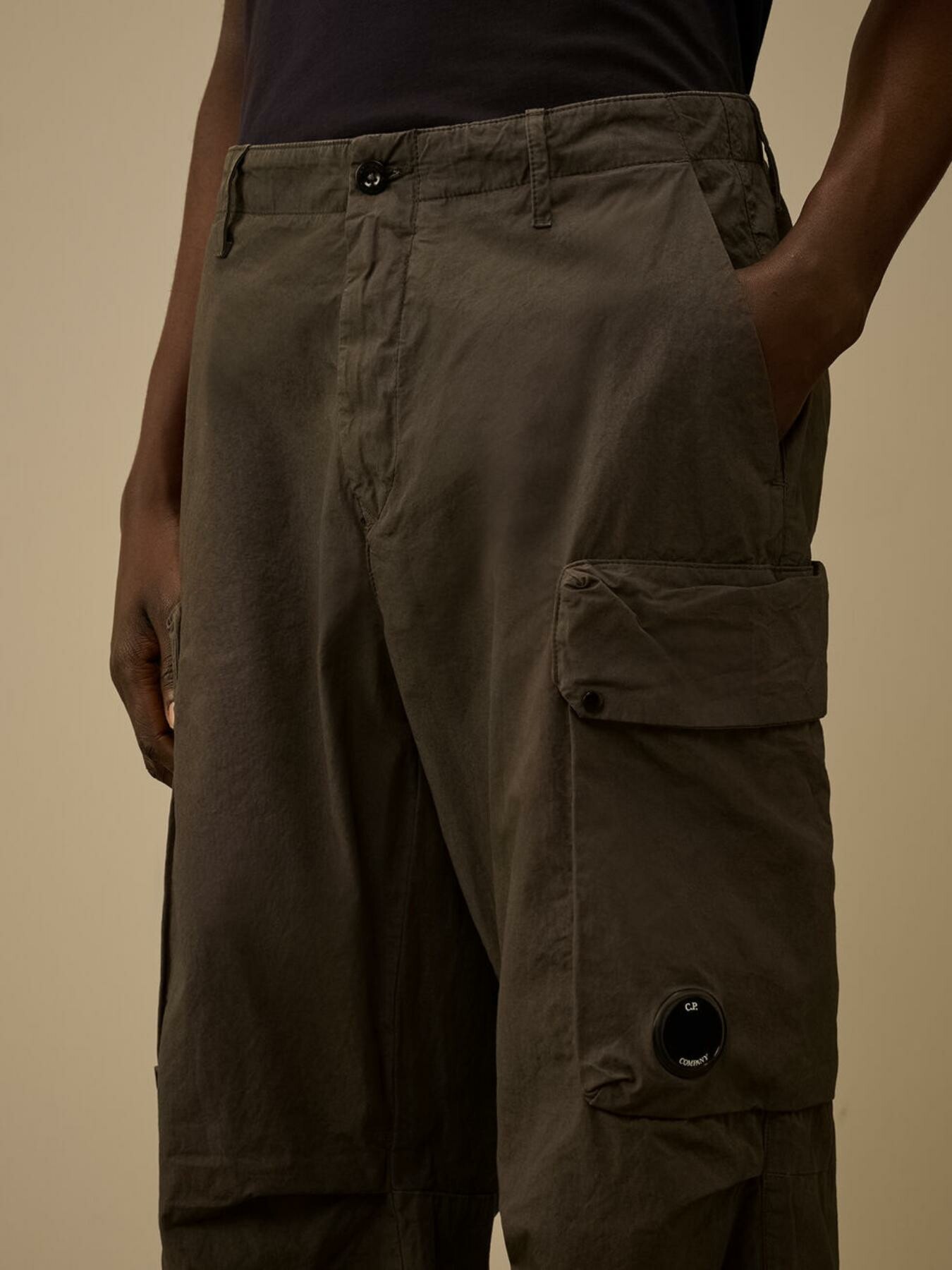 Pantaloni cargo realizzati in Micro-Reps, un tessuto di cotone ad alta densitร caratterizzato da una struttura compatta e una mano morbida. Il modello presenta chiusura con bottone e zip, passanti per cintura e tasche laterali. Dettagli funzionali includono tasche con patta e bottoni automatici con lโiconica Lente di C.P. Company, una tasca posteriore con patta e unโetichetta con logo applicata sul retro. Lโorlo regolabile con coulisse completa il design. Made in Italy. Boxy fit.