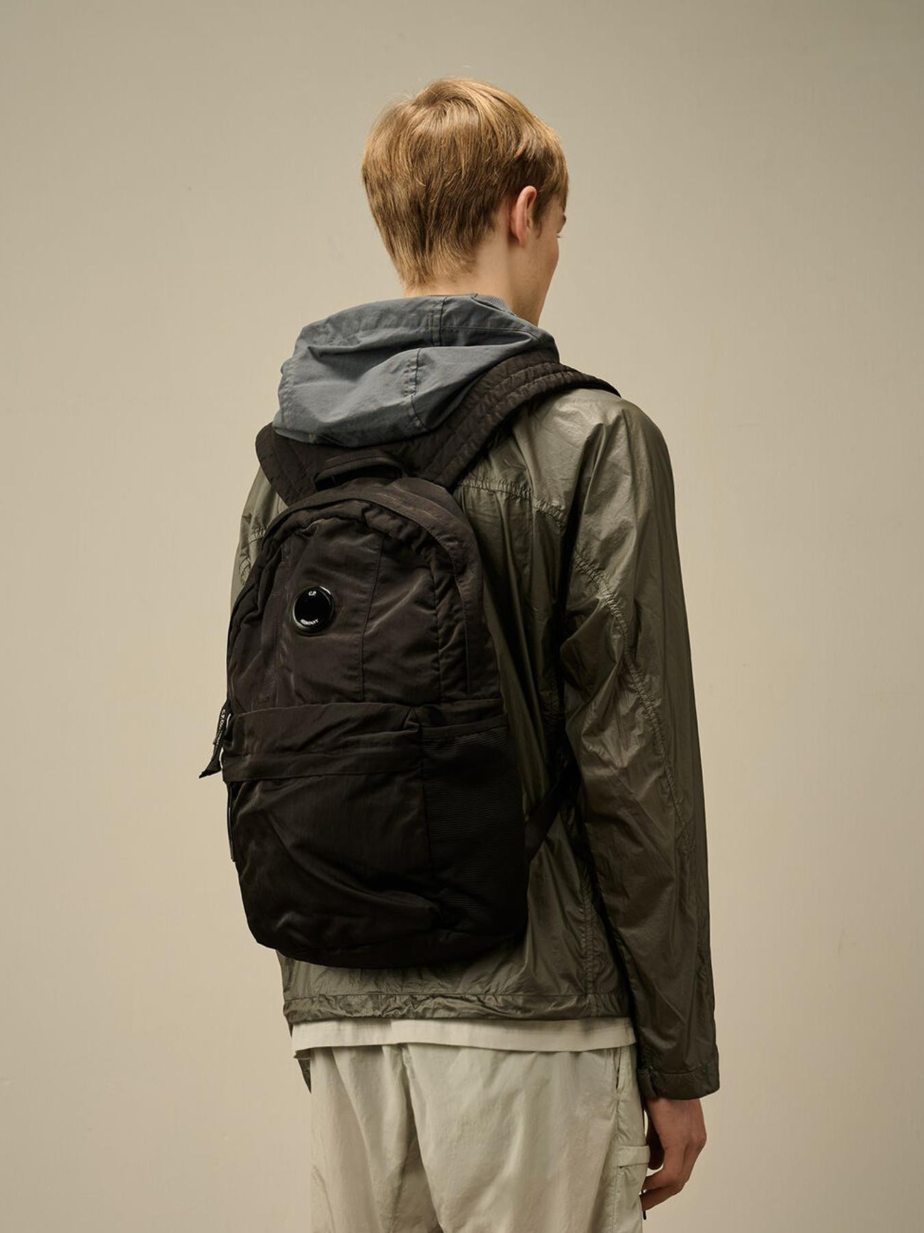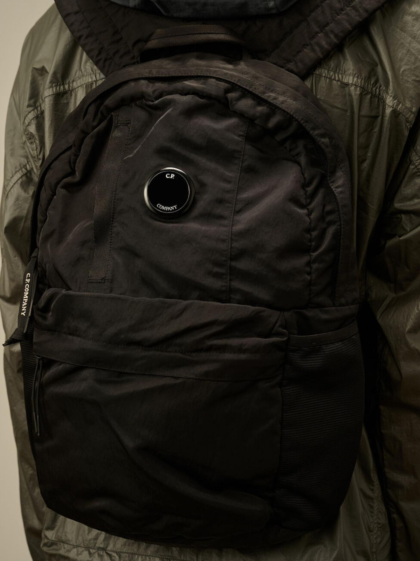 Zaino realizzato in Nylon B multi-filamento lavorato a raso, caratterizzato da Lente. Tinto in capo trattato anti-goccia.