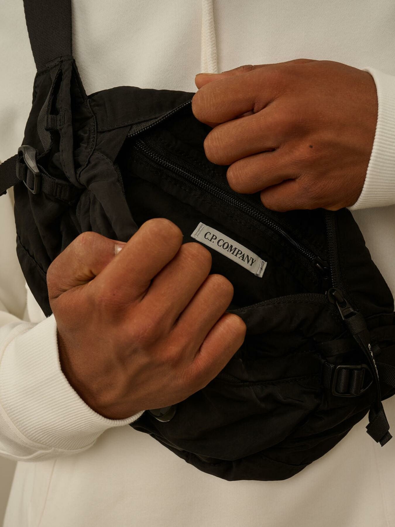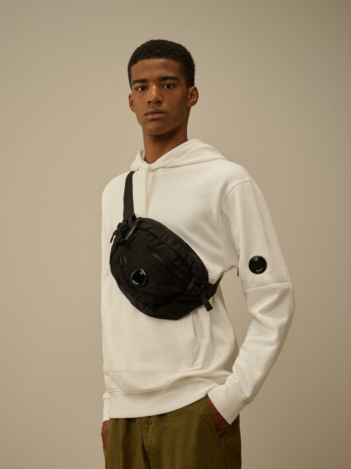 Marsupio a tracolla realizzato in Nylon B, un nylon multi-filamento raso di ispirazione militare. ร dotata di una tracolla regolabile con fibbia, impugnatura e tasche esterne con zip. All’interno, una tasca zip e logo. Rifinito con l’iconica lente di C.P. Company. Tinto in capo e trattato antigoccia.