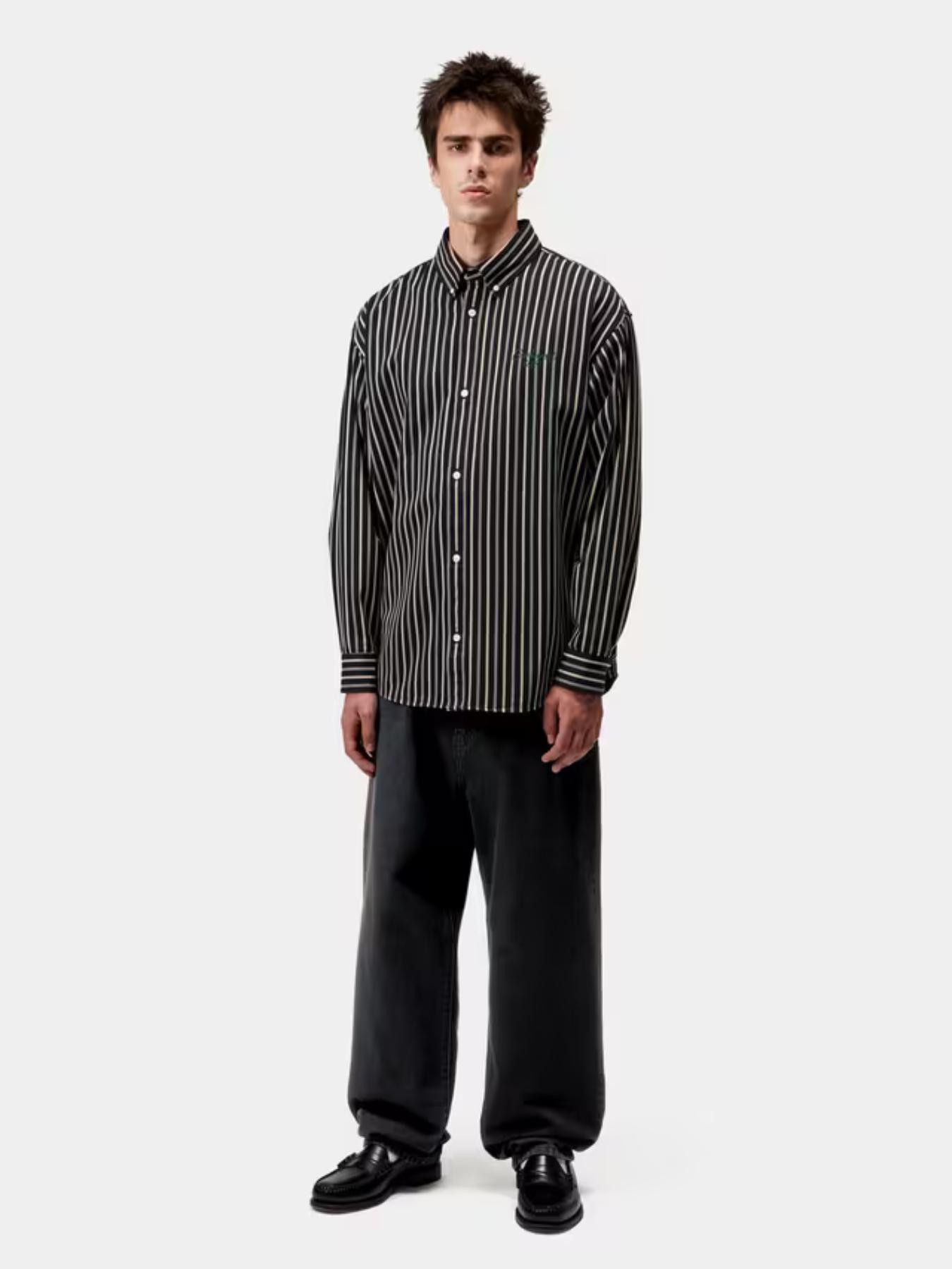 Gli Aaron Pant sono jeans a cinque tasche realizzati in resistente denim di cotone e presentano vestibilitร normale e gamba affusolata. I pantaloni sono disponibili in una gamma di lavaggi, compreso un modello sottoposto a lavaggio con pietre abrasive e una versione piรน chiara sottoposta a lavaggio con candeggina. Sulla tasca posteriore compare unโetichetta quadrata in pelle sintetica.