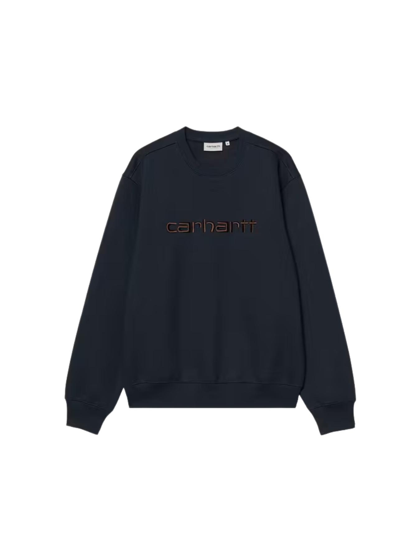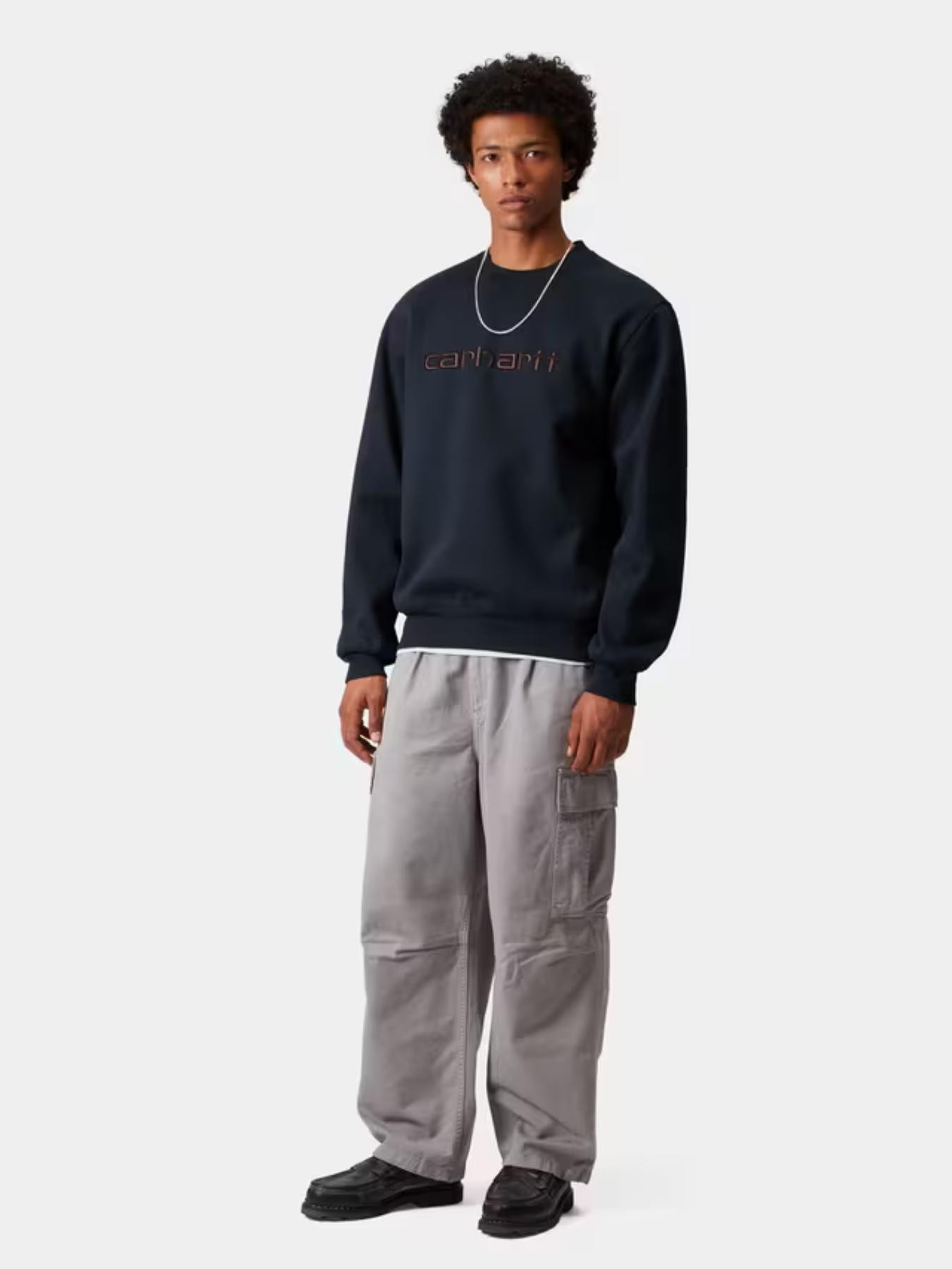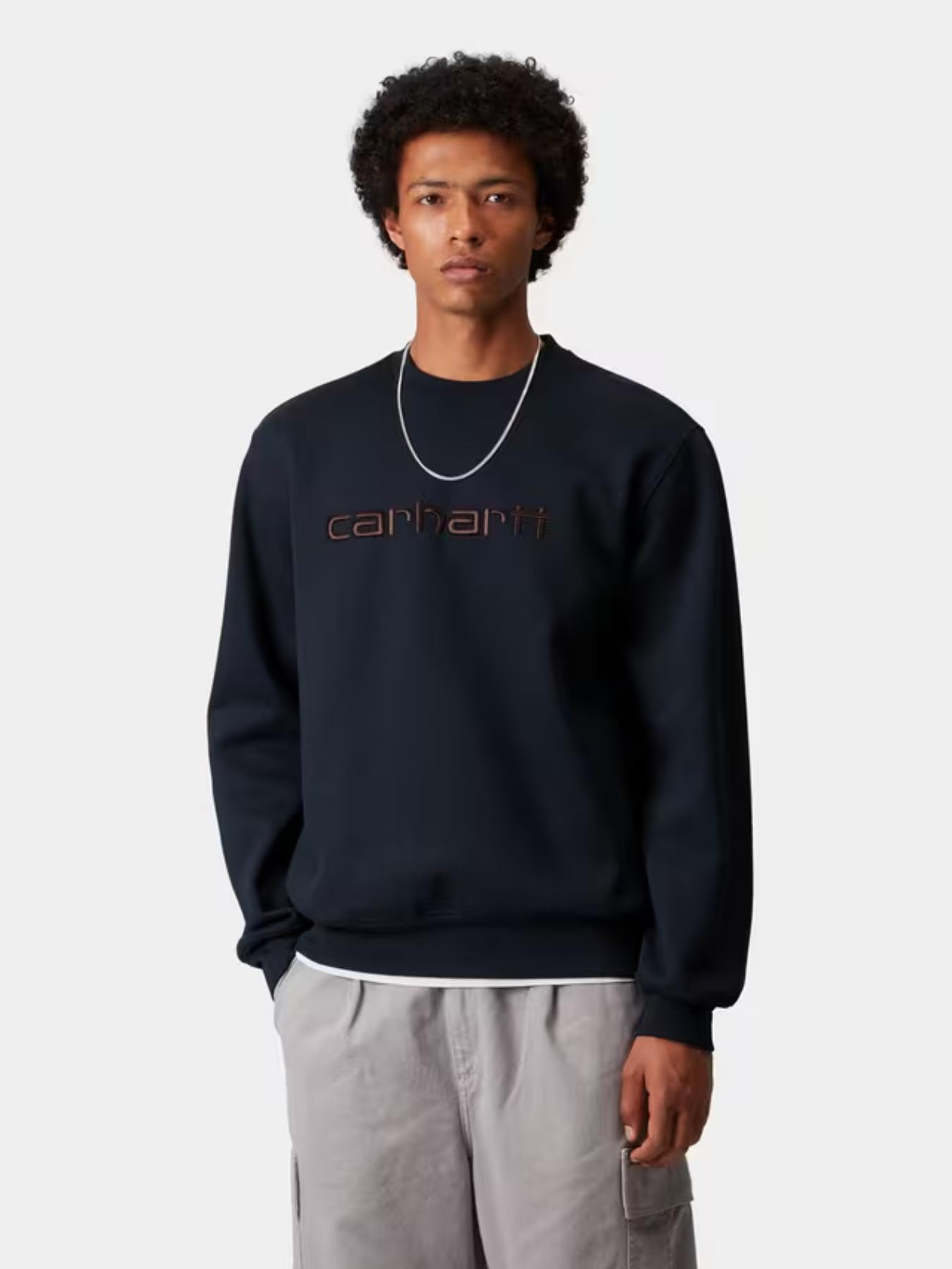 La Carhartt Sweatshirt รจ caratterizzata da vestibilitร ampia ed รจ realizzata in pesante jersey di cotone-poliestere spazzolato per un effetto felpato. Presenta inoltre colletto, orlo e polsini a coste. Sul petto campeggia un ricamo del logo.