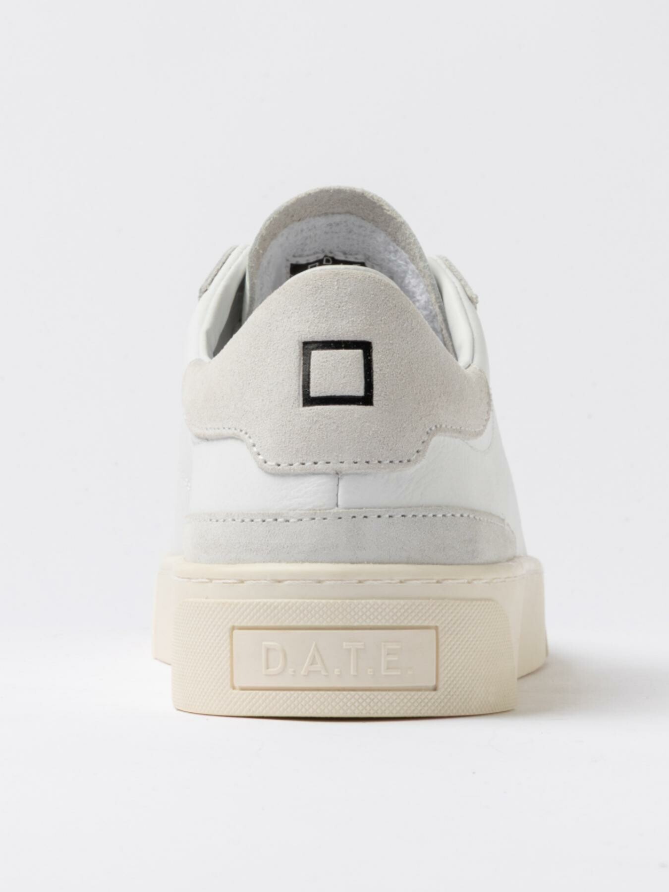 Il logo quadrato รจ impresso nel talloncino in suede bianco.