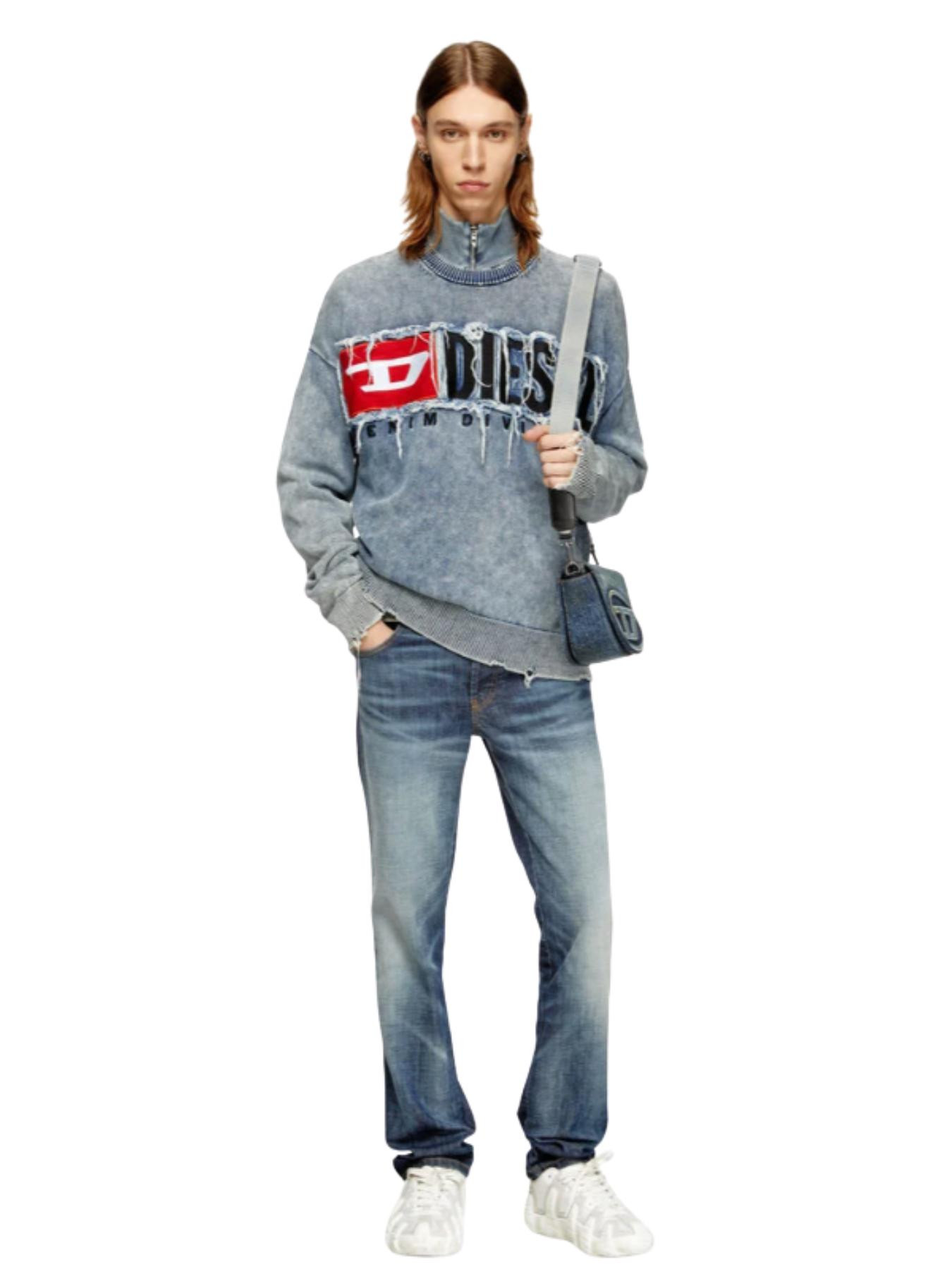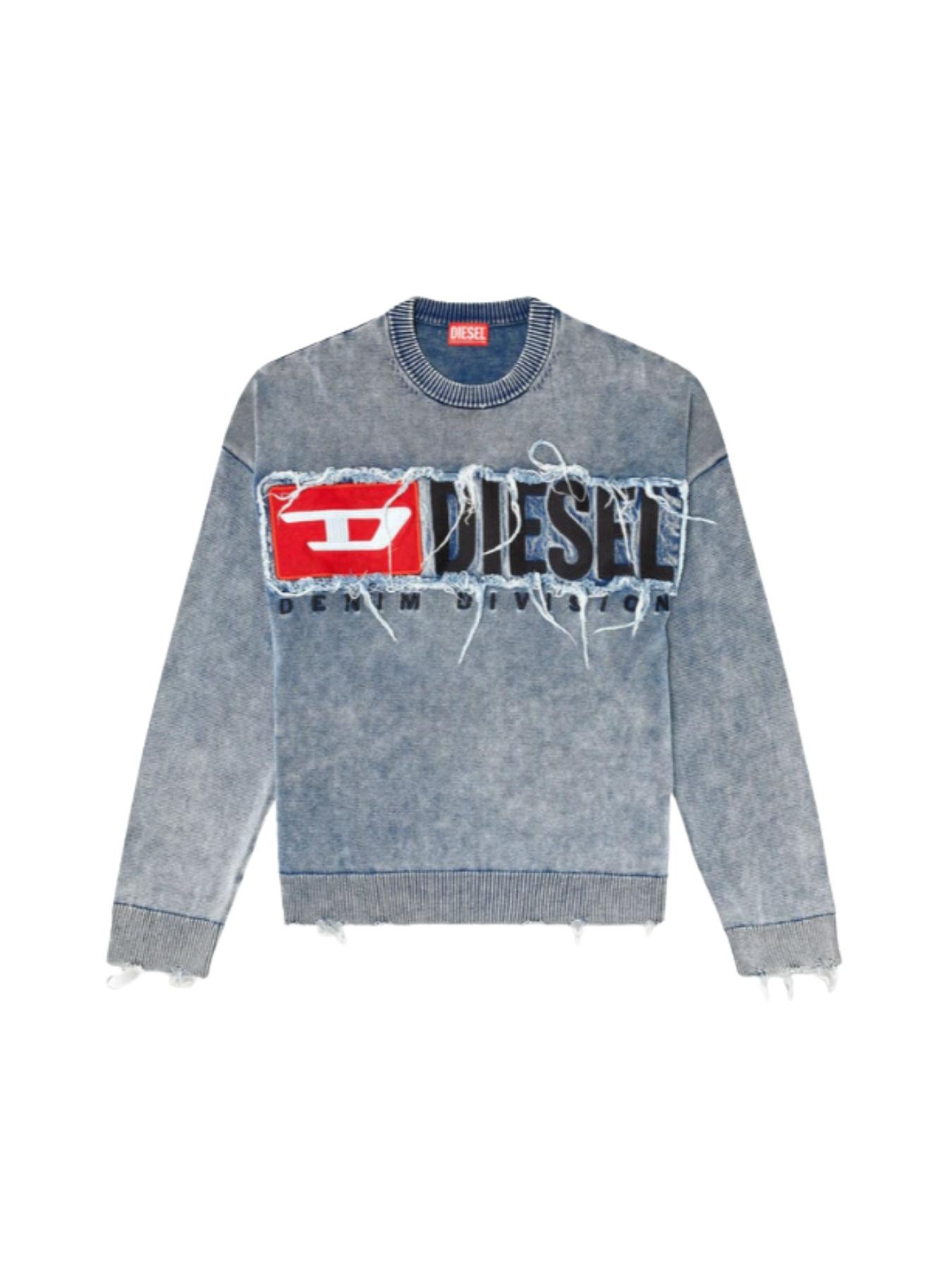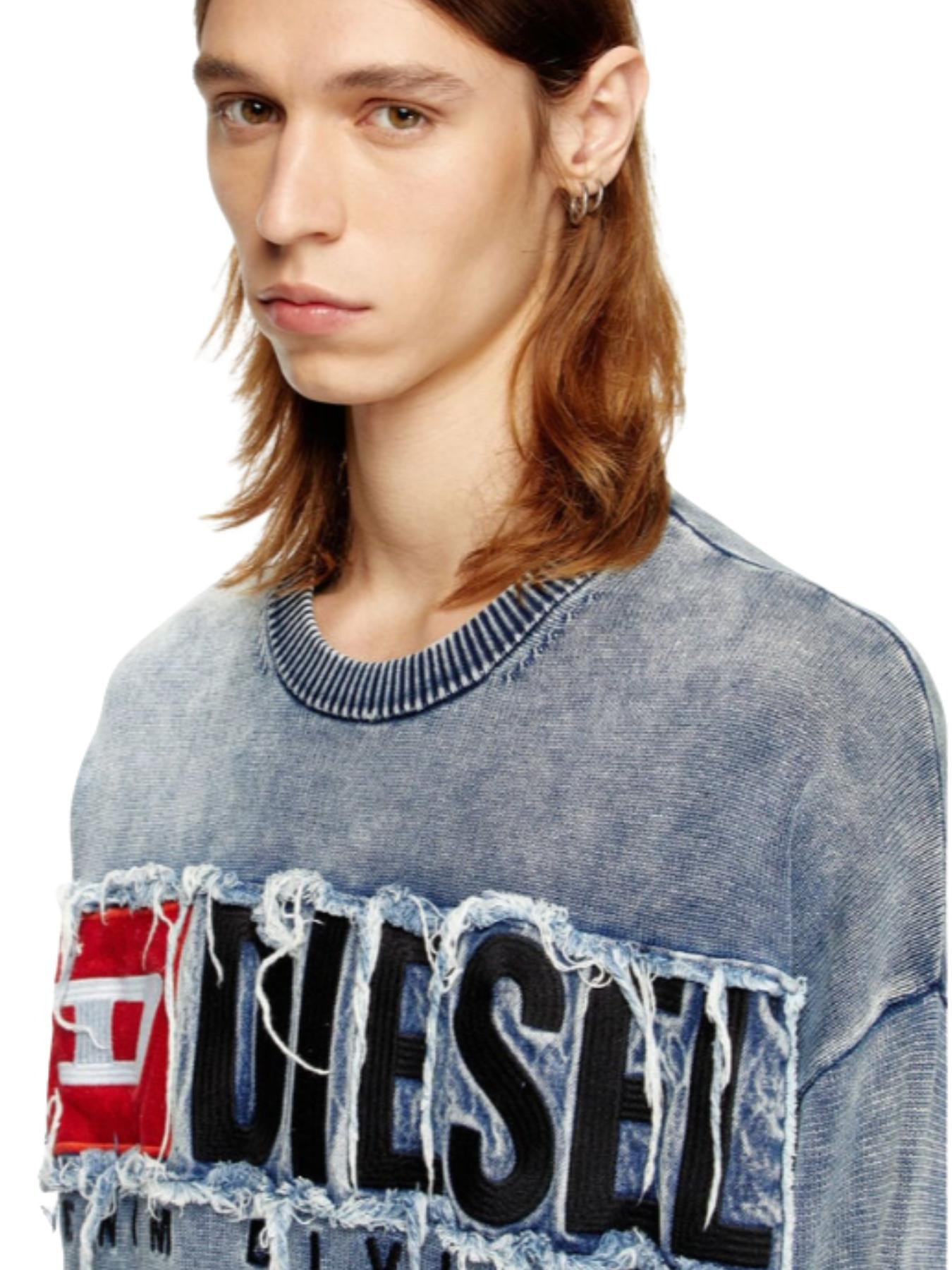 Questa maglia da uomo rappresenta pienamente il DNA del denim Diesel: รจ caratterizzata da uno stile vissuto, una sfumatura marmorizzata e dalla patch ricamata in denim sfrangiato. Realizzata in cotone biologico color indaco, ha maniche a giro basso e bordi a costine.