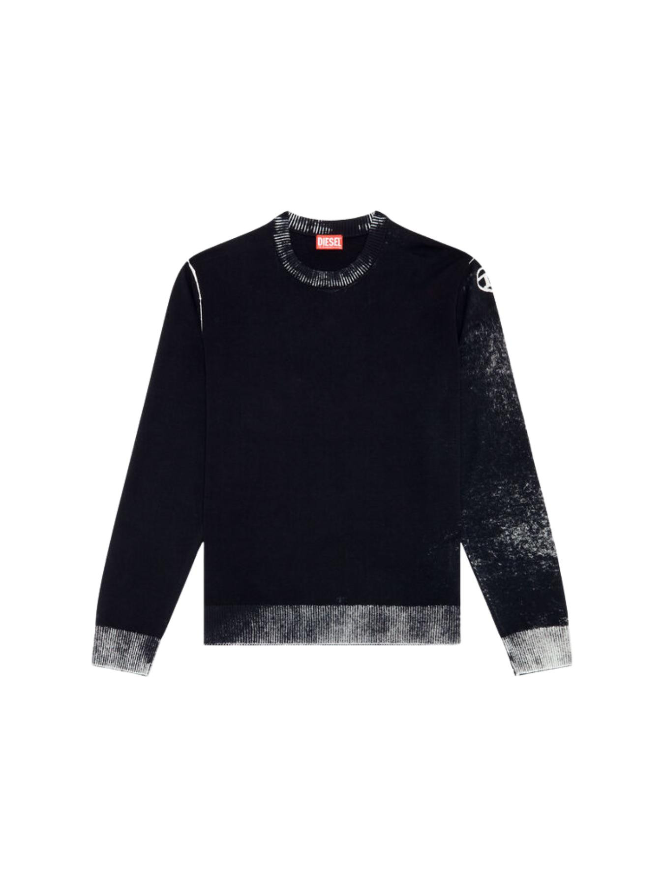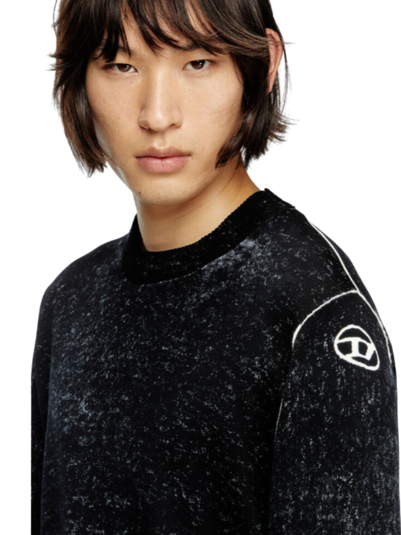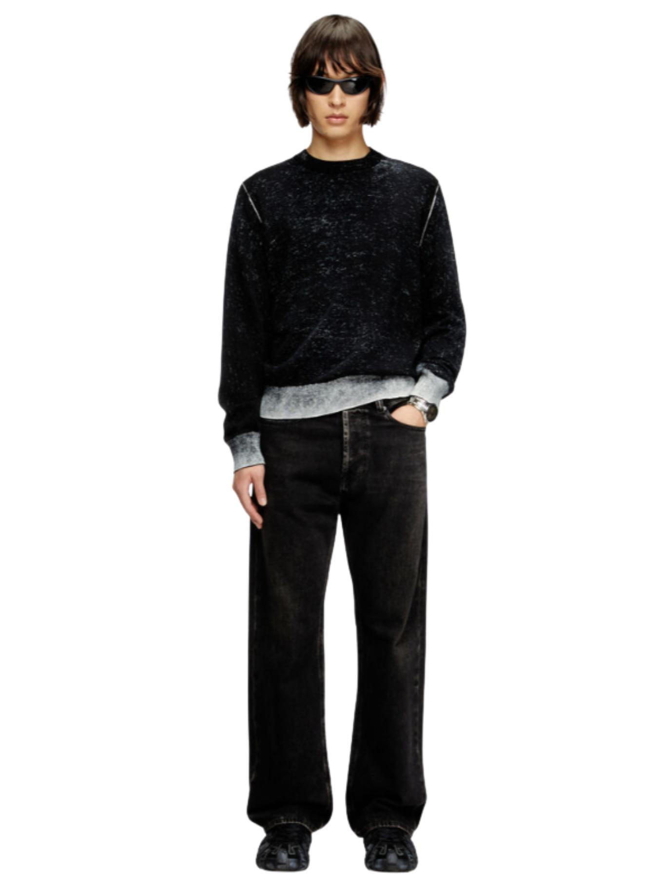 Pullover girocollo da uomo realizzato in un morbido filato di cotone gasato. Il maglione รจ stato stampato dall’interno, creando una colorazione sfumata e non uniforme. L’effetto di questa tecnica รจ particolarmente visibile sui bordi a coste e sulle maniche, dove la tonalitร รจ decisamente piรน chiara.