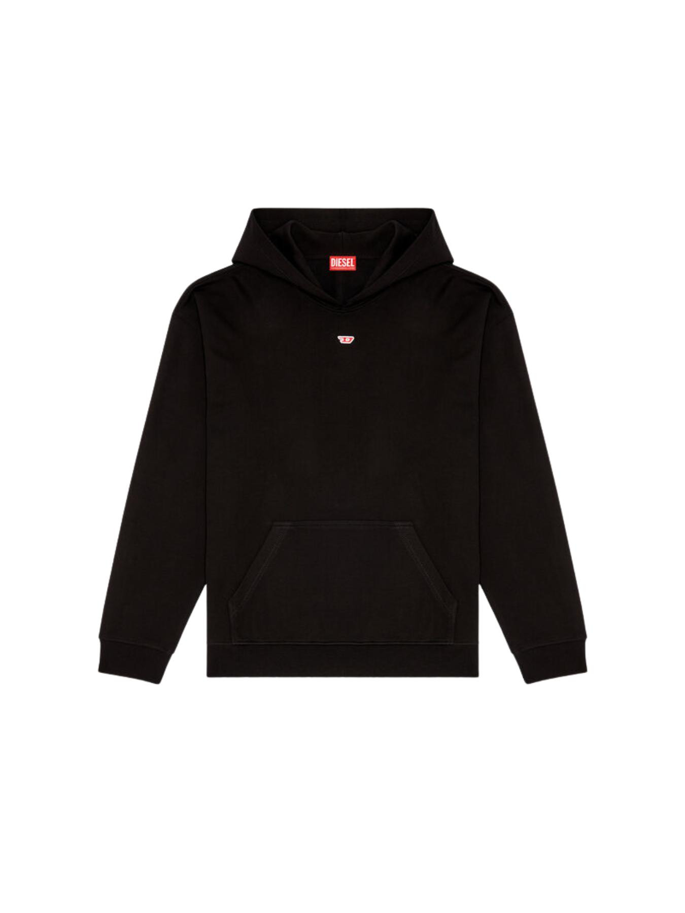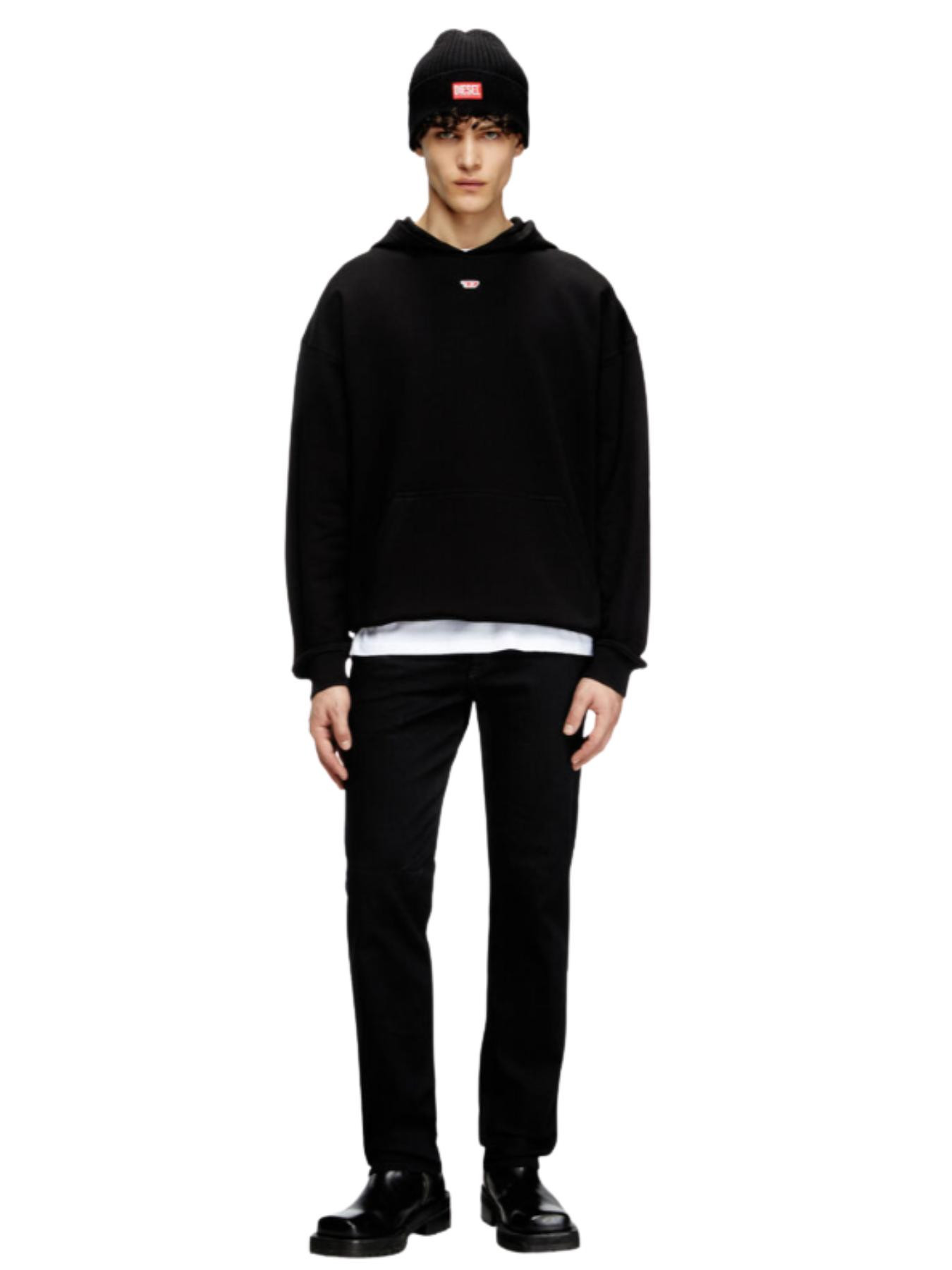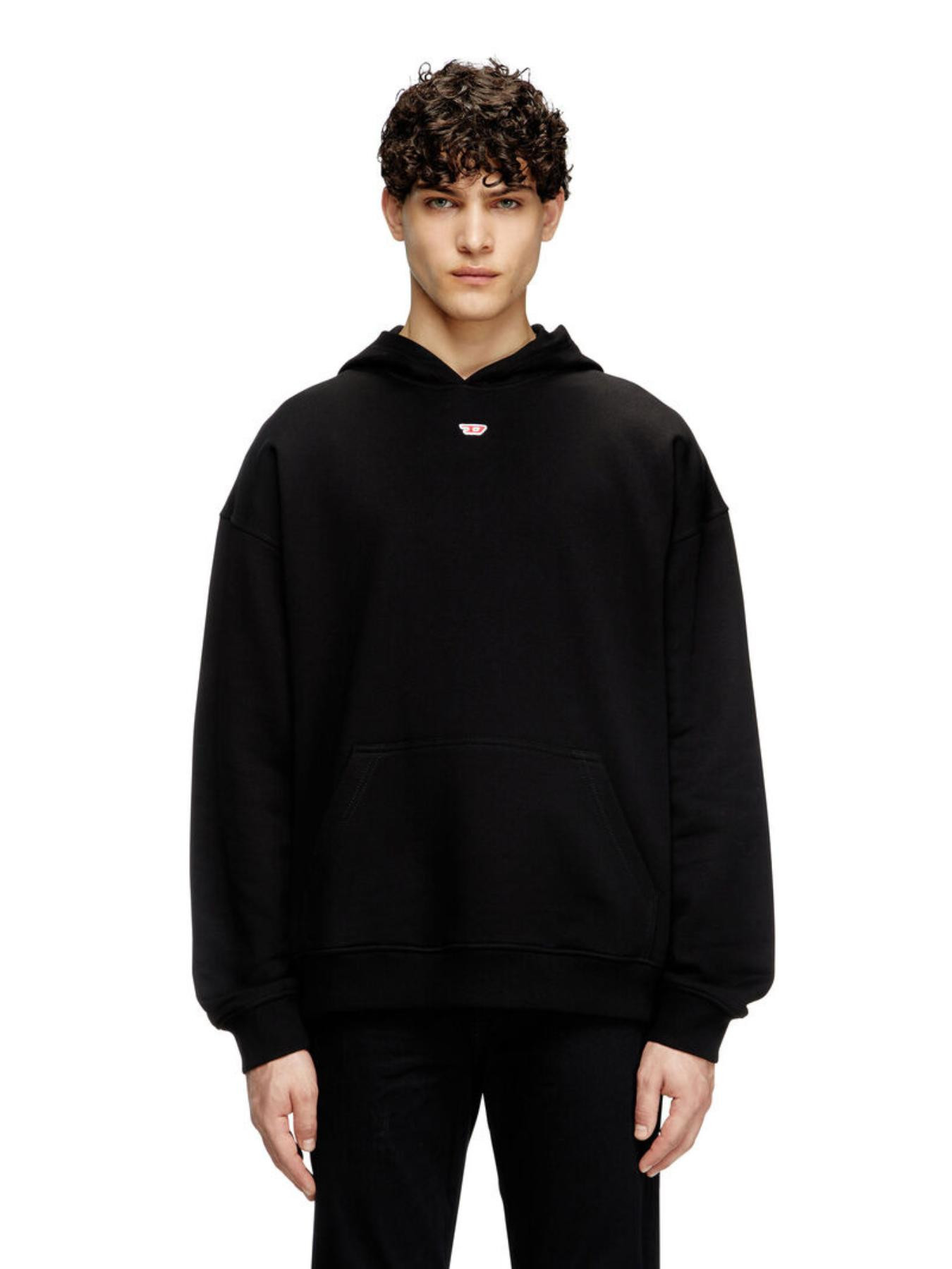 Questa felpa con cappuccio da uomo รจ un modello essenziale, realizzato con cotone biologico. La silhouette รจ leggermente boxy e rilassata, con una patch logo rossa a forma di D sul petto.