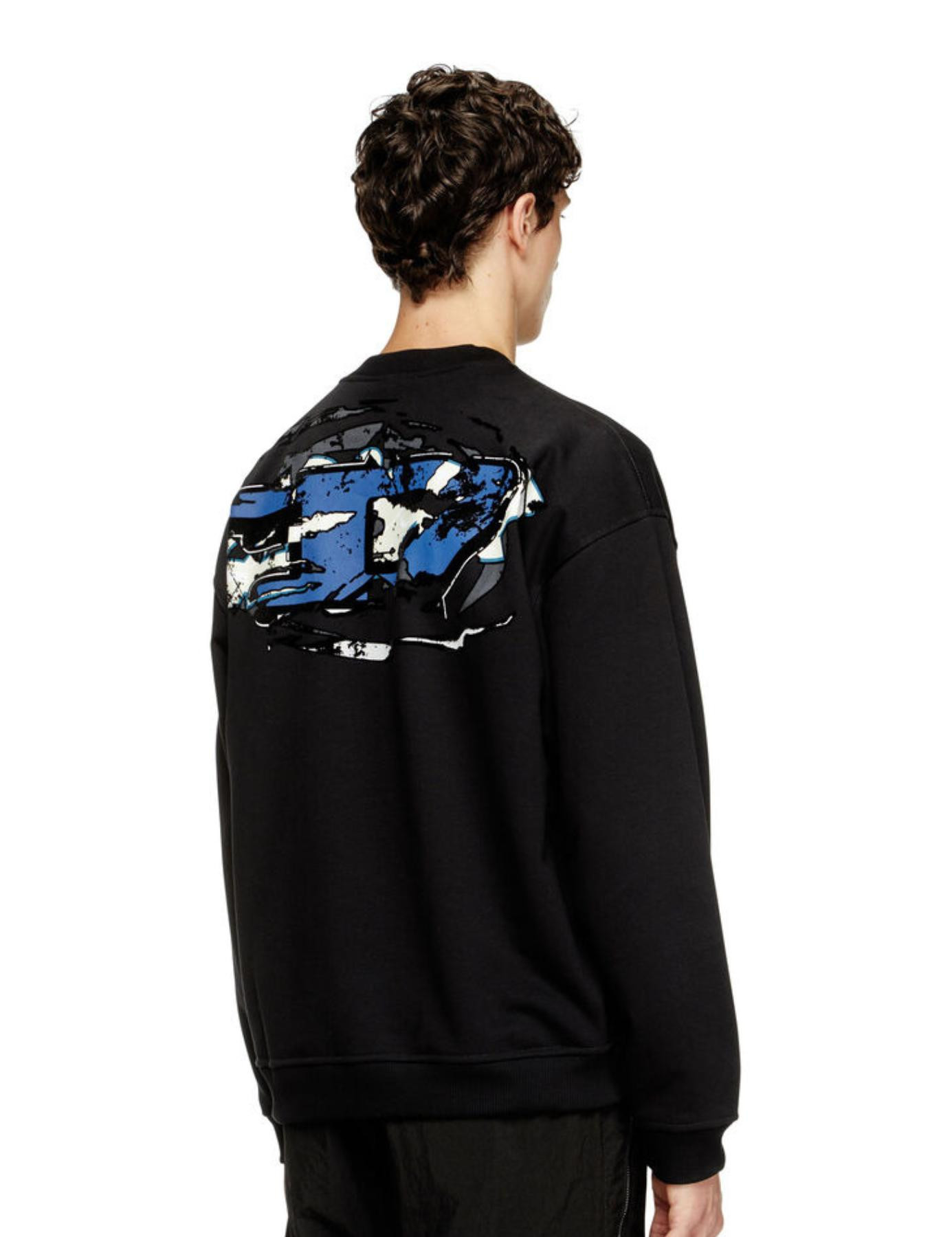 Casual e oversize, questa felpa da uomo รจ realizzata in jersey garzato di cotone biologico e poliestere riciclato. Il retro รจ decorato con una reinterpretazione “glitch” del classico logo Oval D che completa l’aspetto vissuto del capo.