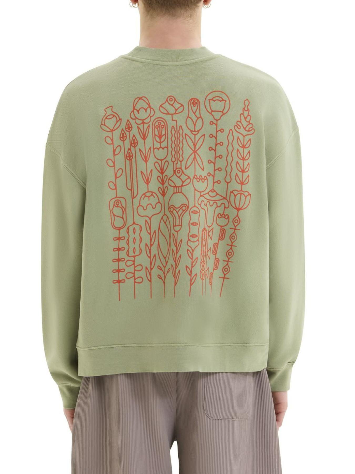 Nuova interpretazione della felpa girocollo oversize, con spalle scese e linea morbida sul busto. Il design ๏พฮดฮตใค๏ฝจ completato da un grande ricamato floreale sulla sinistra, che ricorda le fantasie iconiche del brand. Fondo capo, scollo e polsi con dettagli a costine.