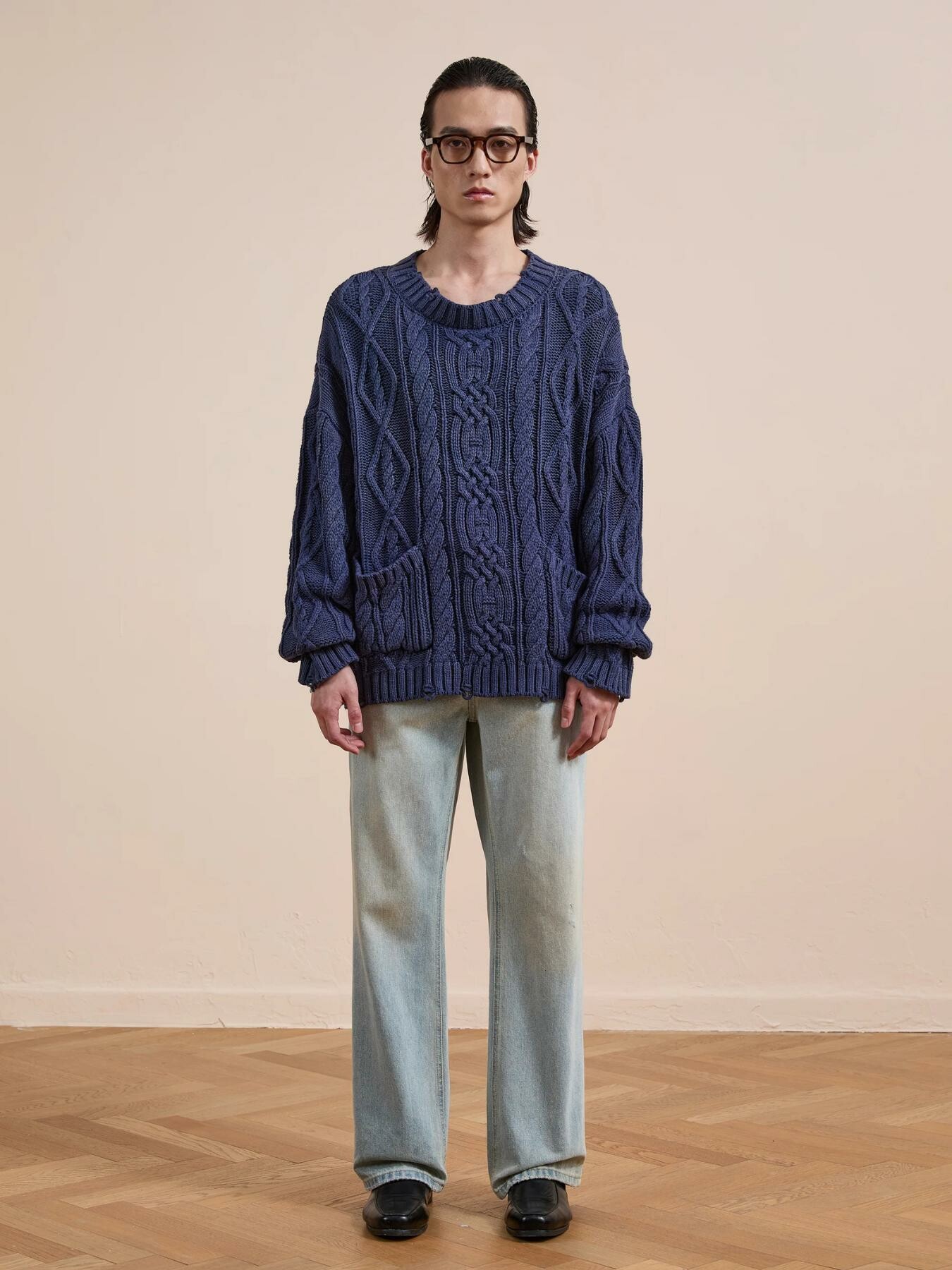 Our Cable Knit Sweater features a rich, dampened navy blue color with double pockets at the waist. The chunky knit adds softness and warmth.