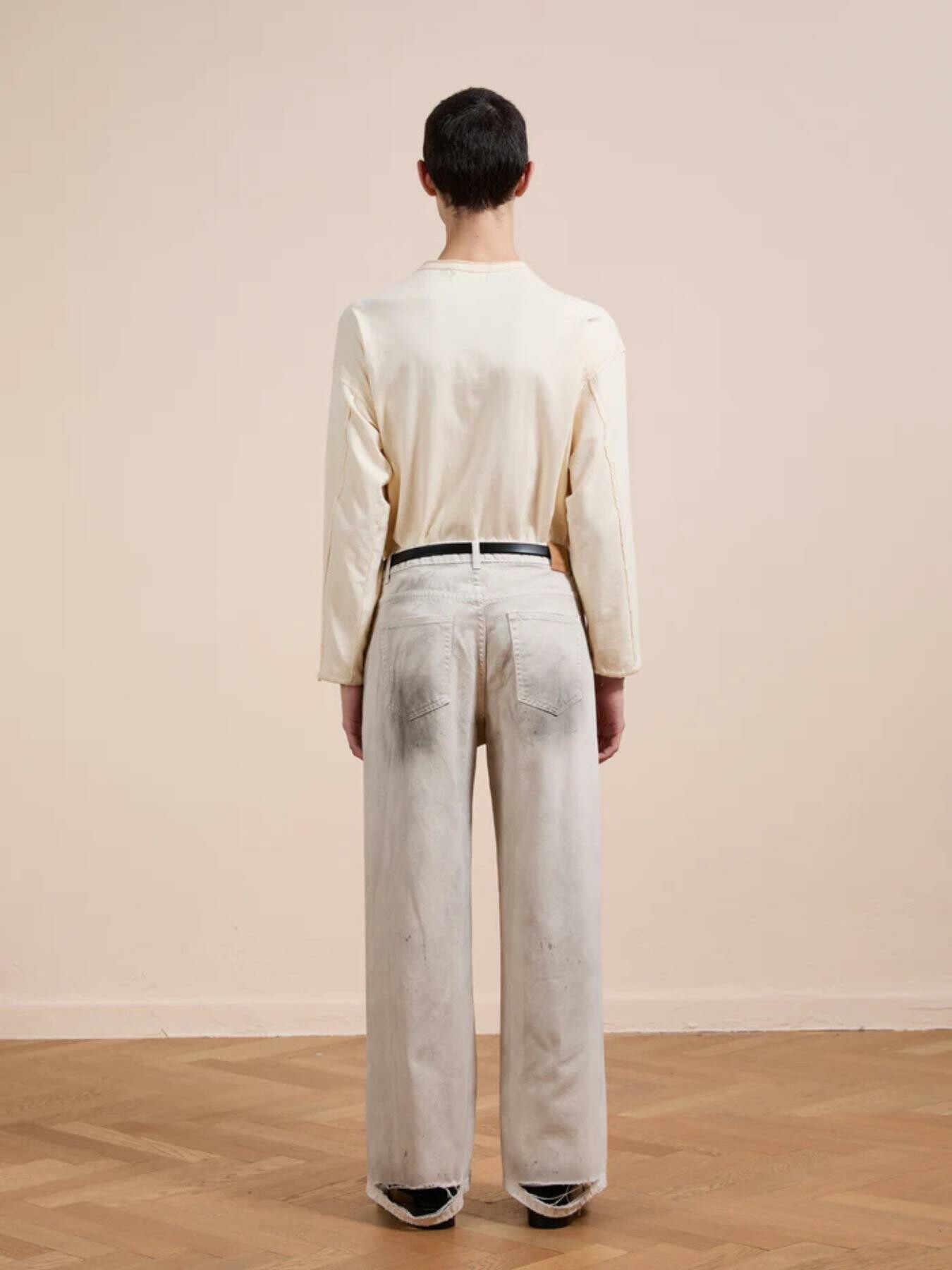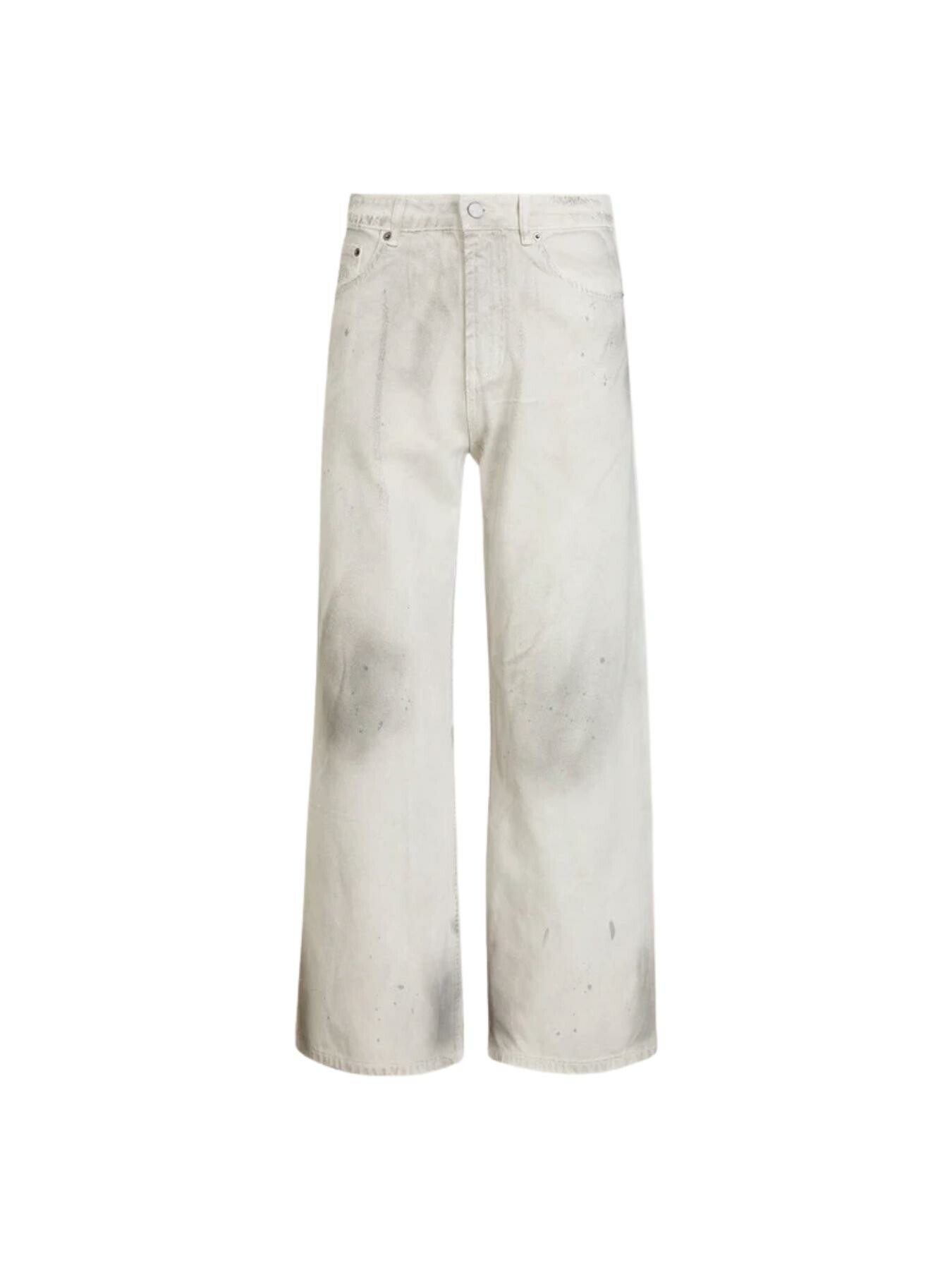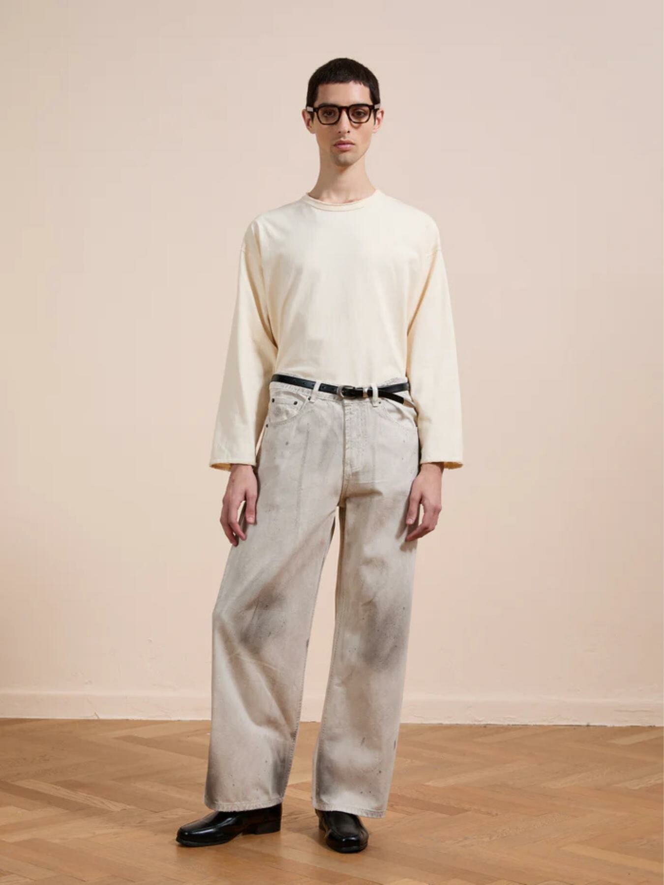 Our take on the classic wide-leg jean, finished in a distressed concrete wash. This garment features thoughtfully placed abrasions and hand-finished markings that evoke a sense of lived-in texture and depth. Cut in a classic five-pocket silhouette, itโs shaped with a mid rise and a relaxed, wide-leg profile.