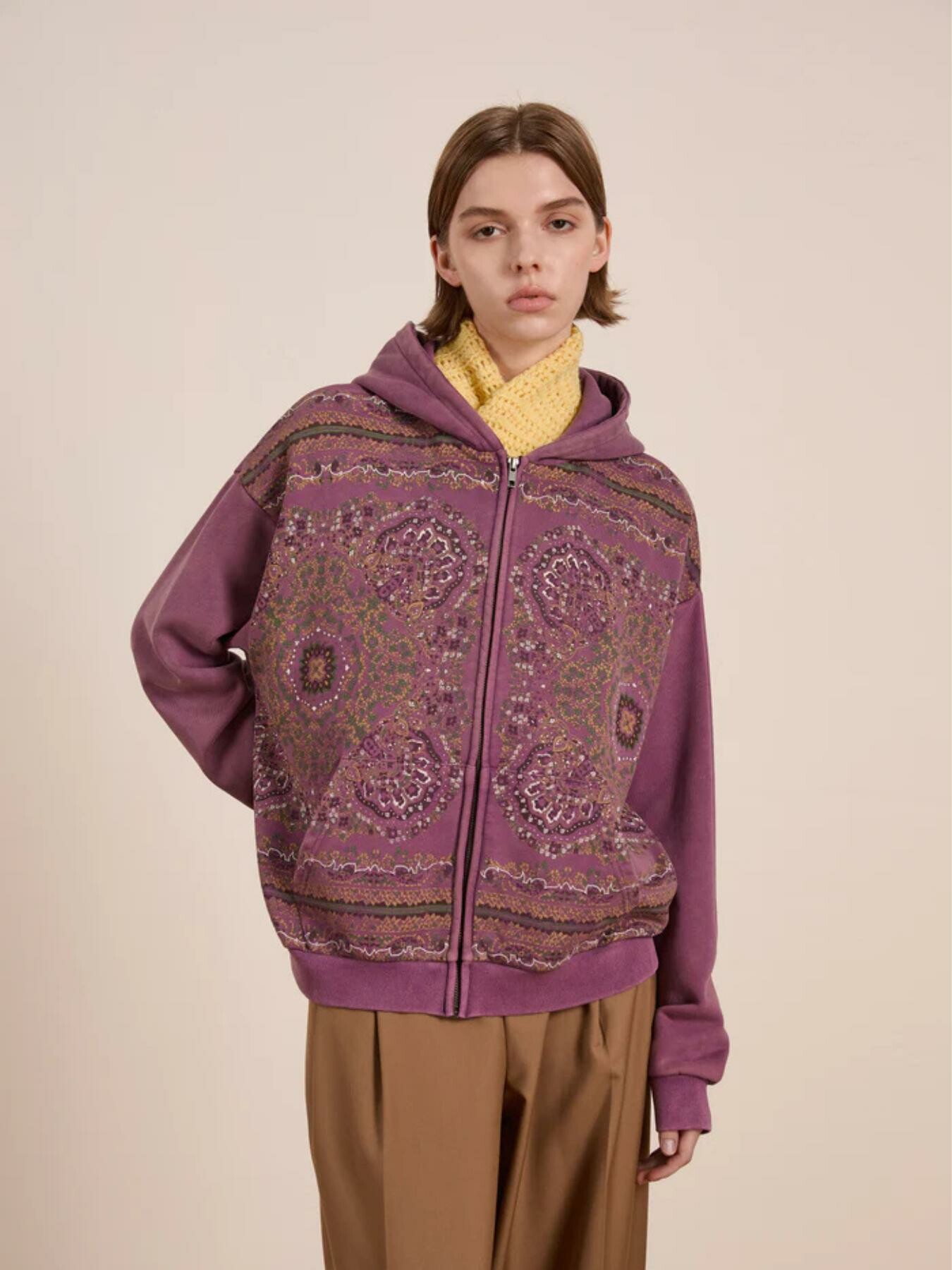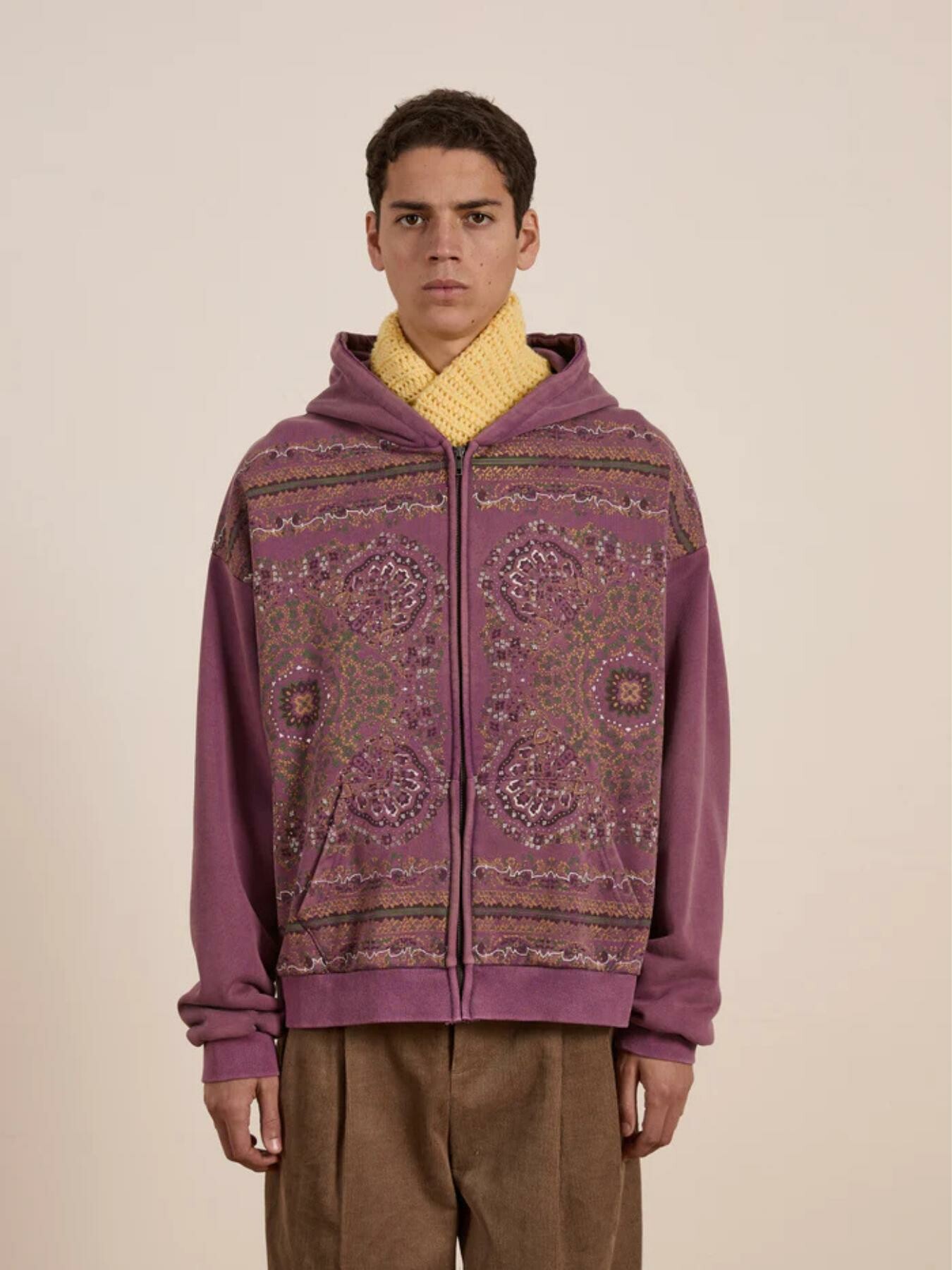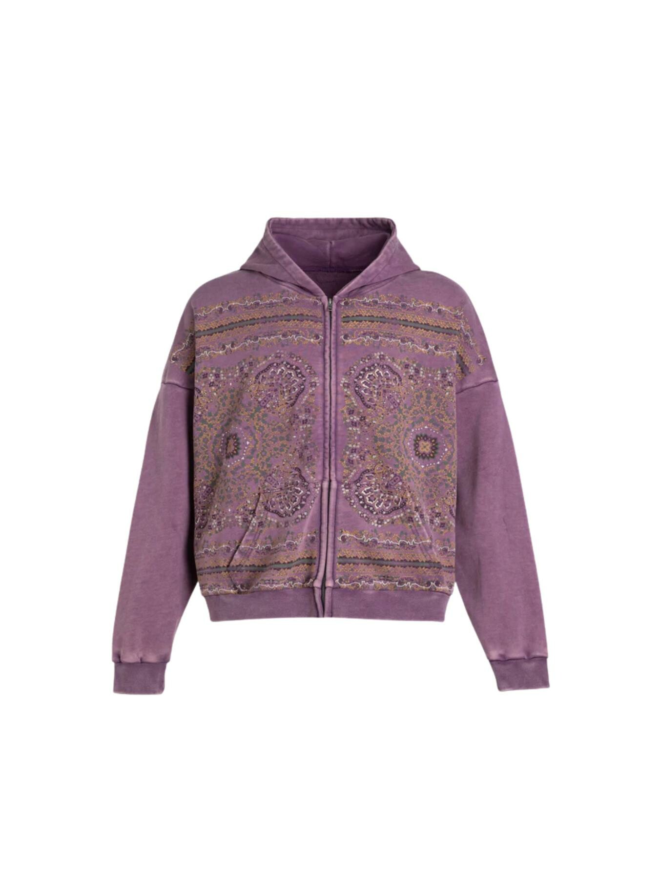 A fusion of intricate design and casual wear, the Motif Zip-Up Hoodie is constructed from soft cotton. All-over printed mandala art adds depth and texture, while the hood and ribbed cuffs provide structure. Heavy wash and fading give an overall worn appearance. The zip closure allows for versatile styling, making it an elevated take on a streetwear essential.