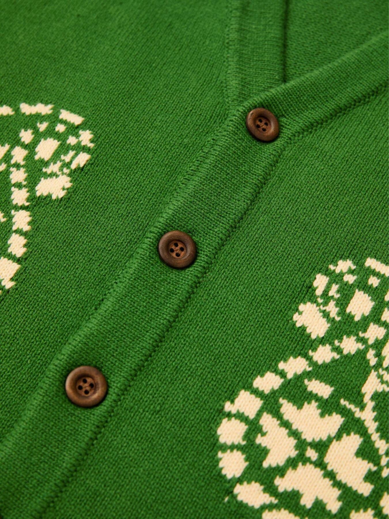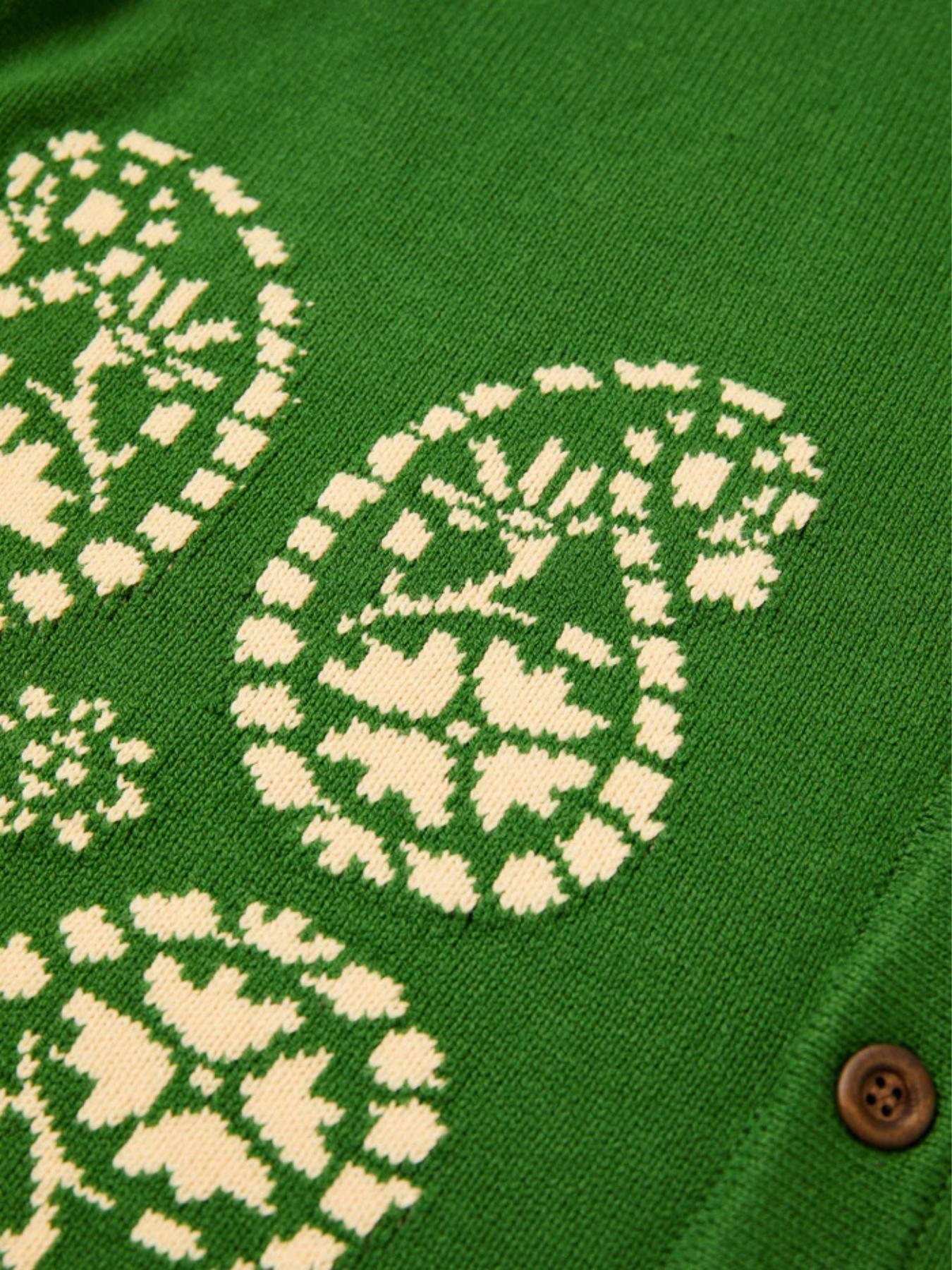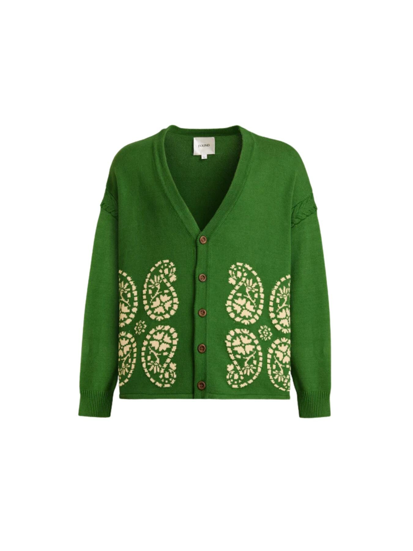 Inspired by traditional South Asian textile patterns, our Paisley Knit Cardigan features a contrast cream jacquard motif against rich green cotton knit. Itโs finished with a V-neckline and wooden buttons, while the sleeves are accented with cable-knit detailing for added texture. With a relaxed fit and ribbed cuffs, it layers effortlessly over shirts or tees, bringing warmth and craft to everyday wear.
