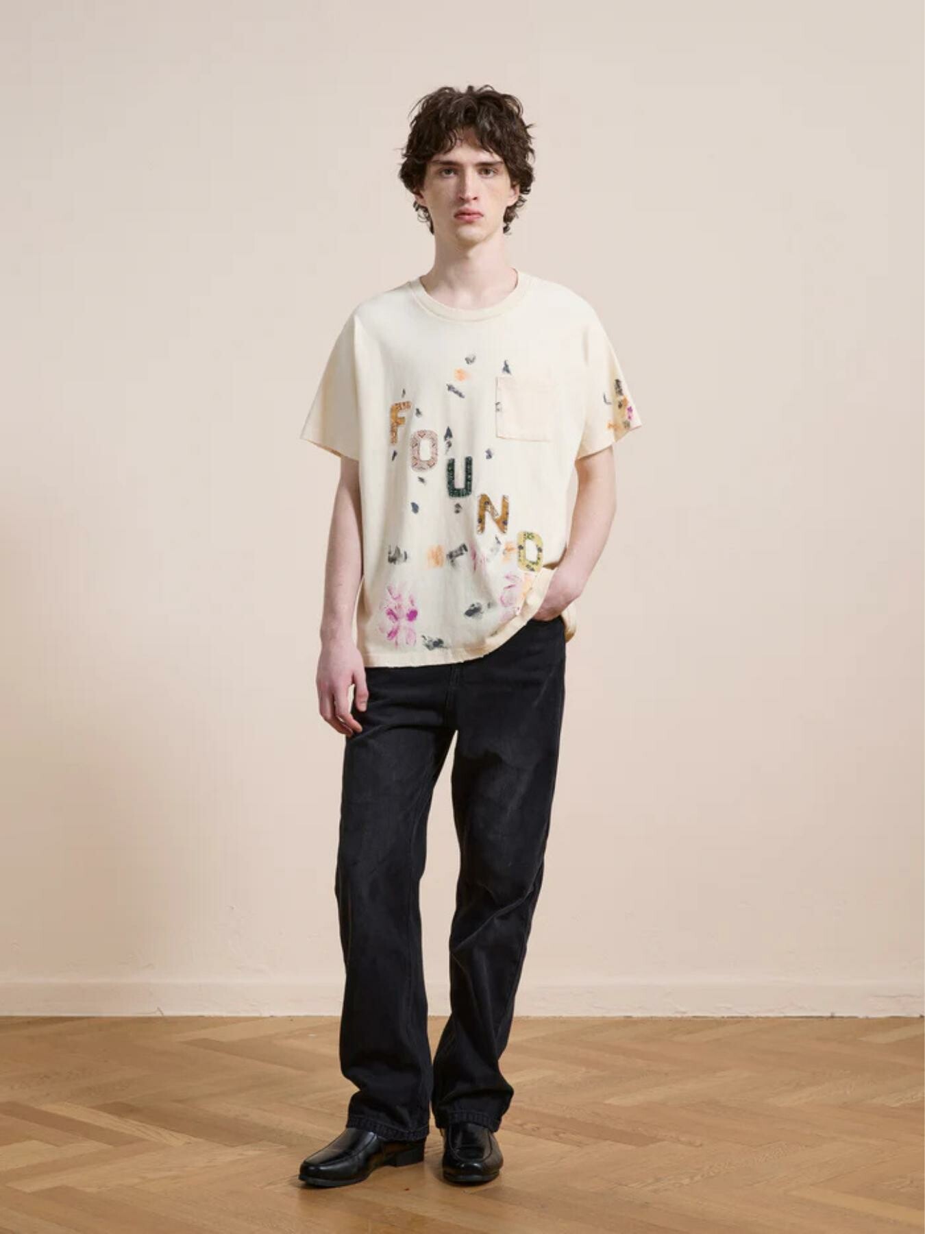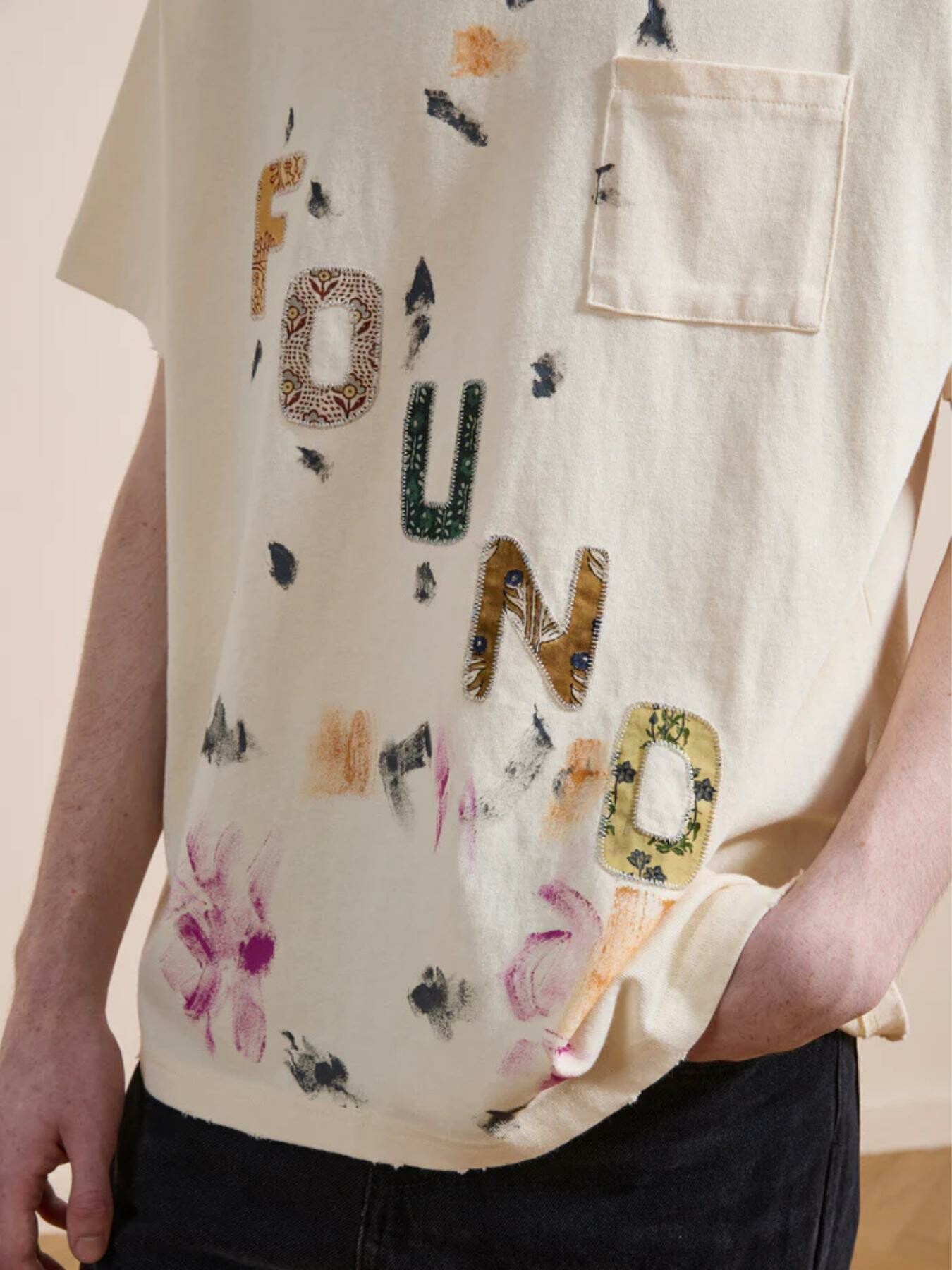 At the front, an artful โFOUNDโ motif is rendered through textured appliquรฉ, enriched with mixed fabrics and intricate detailing. Painterly splashes and handprint accents add a spontaneous, almost gallery-like finishโeach piece feeling uniquely expressive.