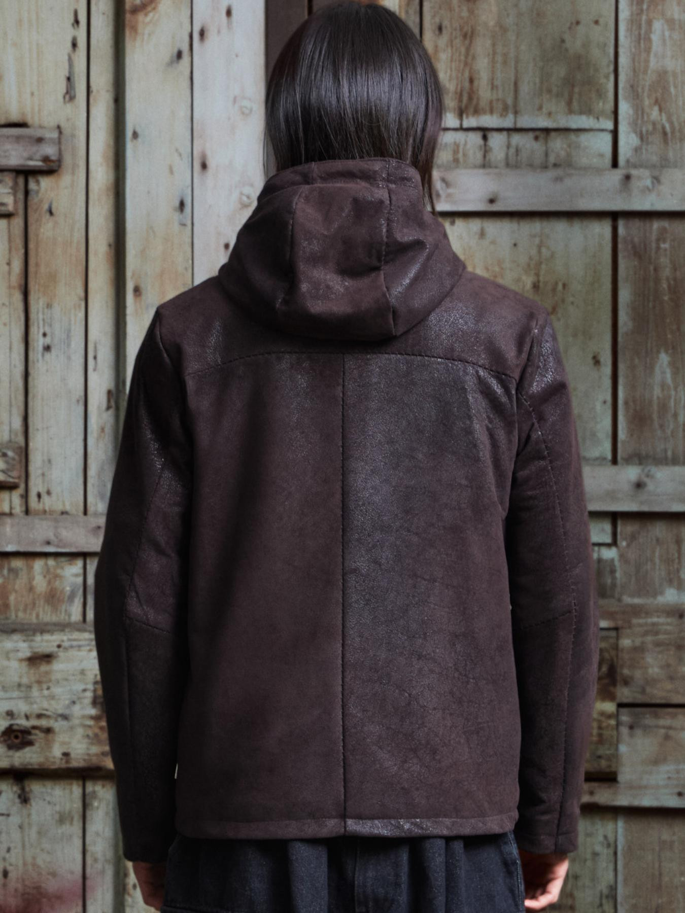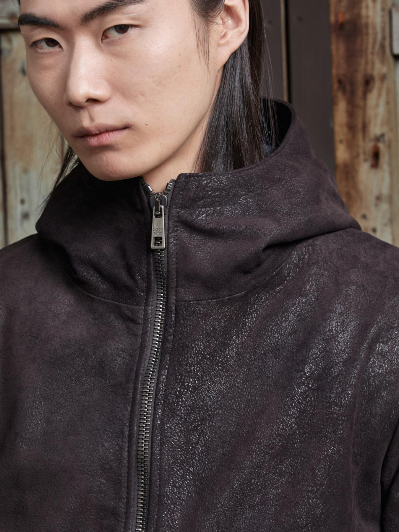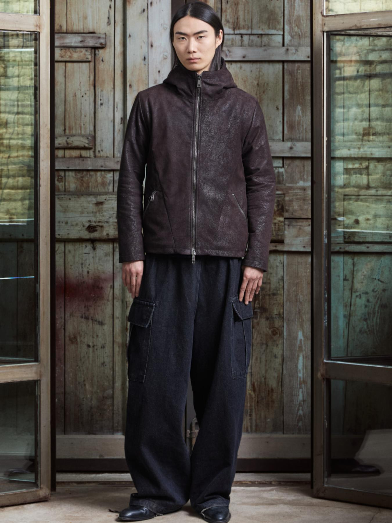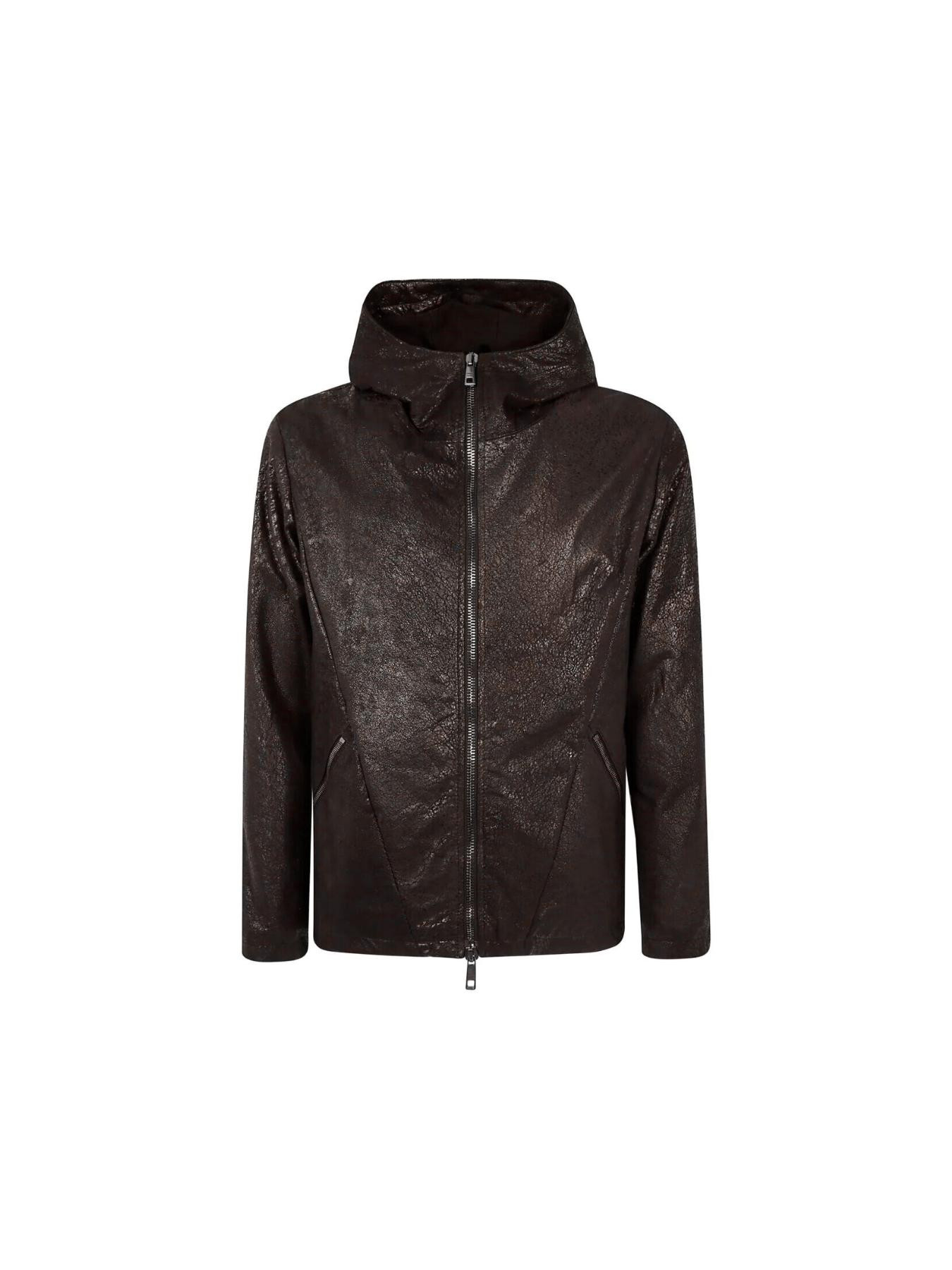 Giorgio Brato – JACKET CON CAPPUCCIO SU PELLE CERATA SCREPOLATA- – ZIP CENTRALE – TASCHE CON ZIP CHIUSURA A ROVESCIO – CUCITURE A SACCO
