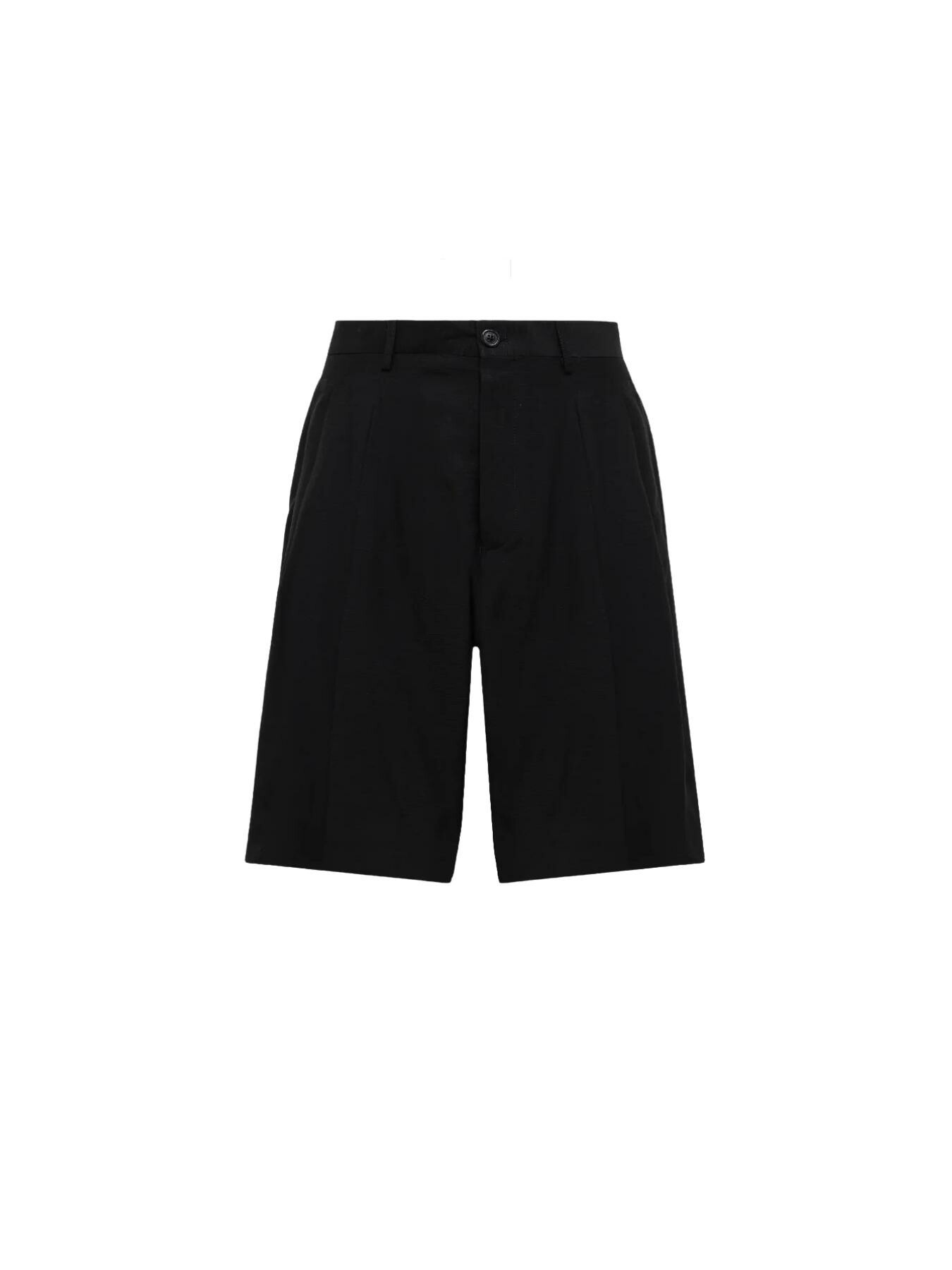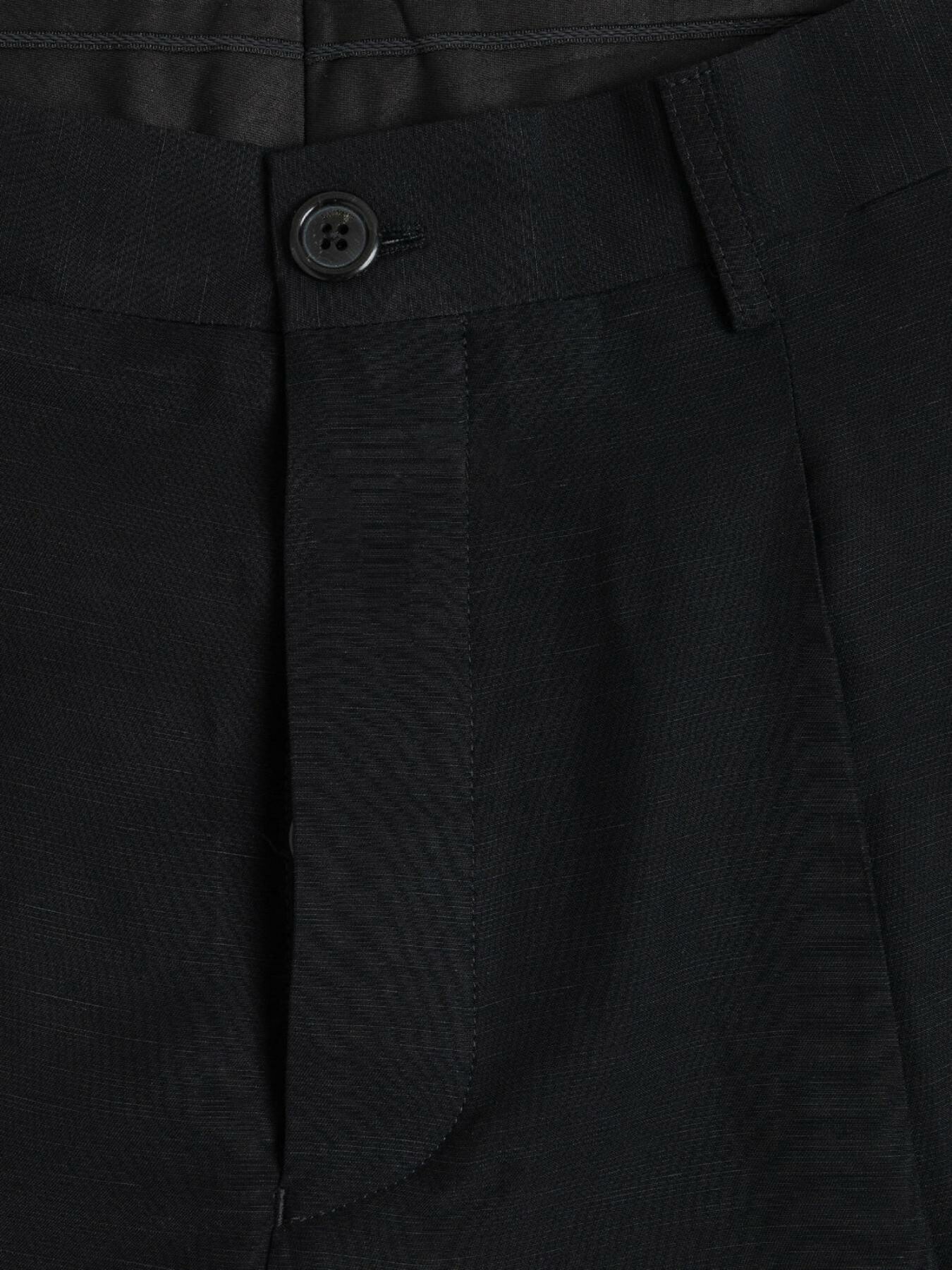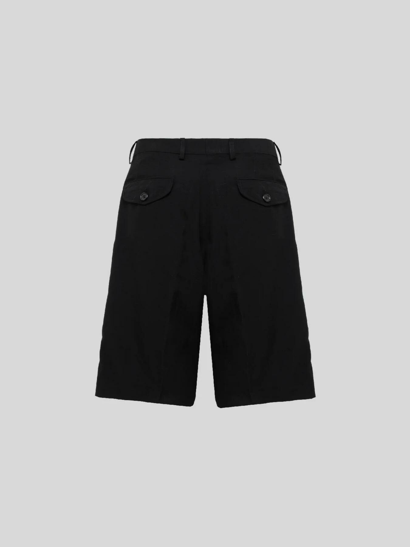 Bermuda tailoring realizzato in misto lino tinta unita. Vita alta con passanti e pinces. Chiusura con bottone e zip. Le tasche laterali a filo e sul retro con patta e bottone completano il capo. Regular fit. Made in Italy.