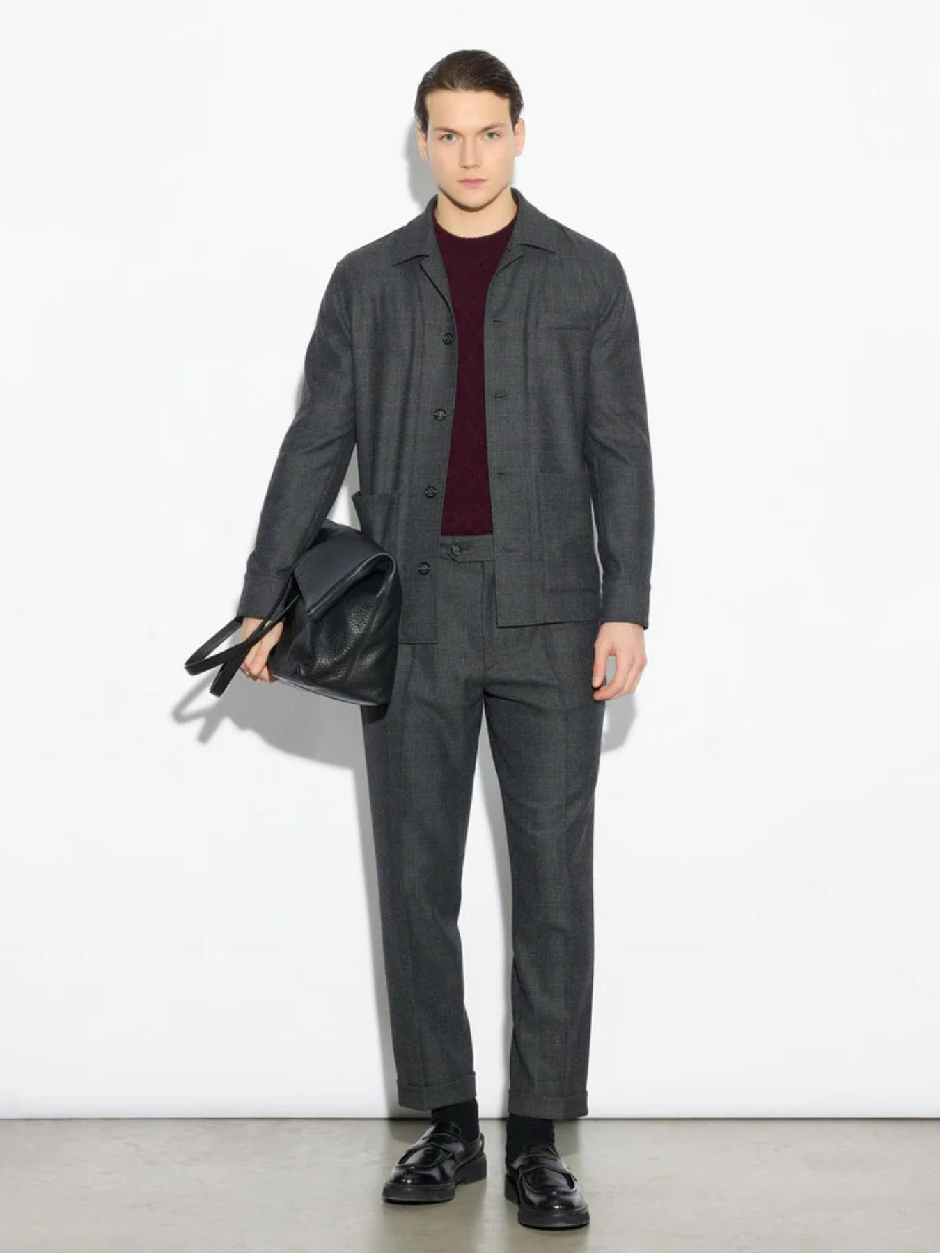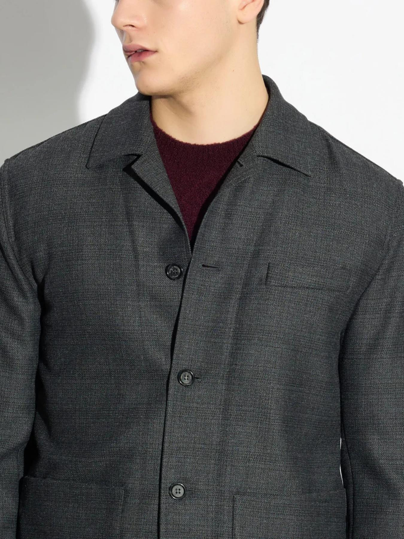 Giacca camicia sfoderata in fresco lana Principe di Galles con fondo grigio. Il design essenziale con colletto classico, chiusura a bottoni e tasche applicate interpreta lโeleganza sartoriale in chiave contemporanea. Un capo versatile e sofisticato, perfetto per completare look da ufficio o abbinamenti casual chic durante la stagione autunno-inverno.