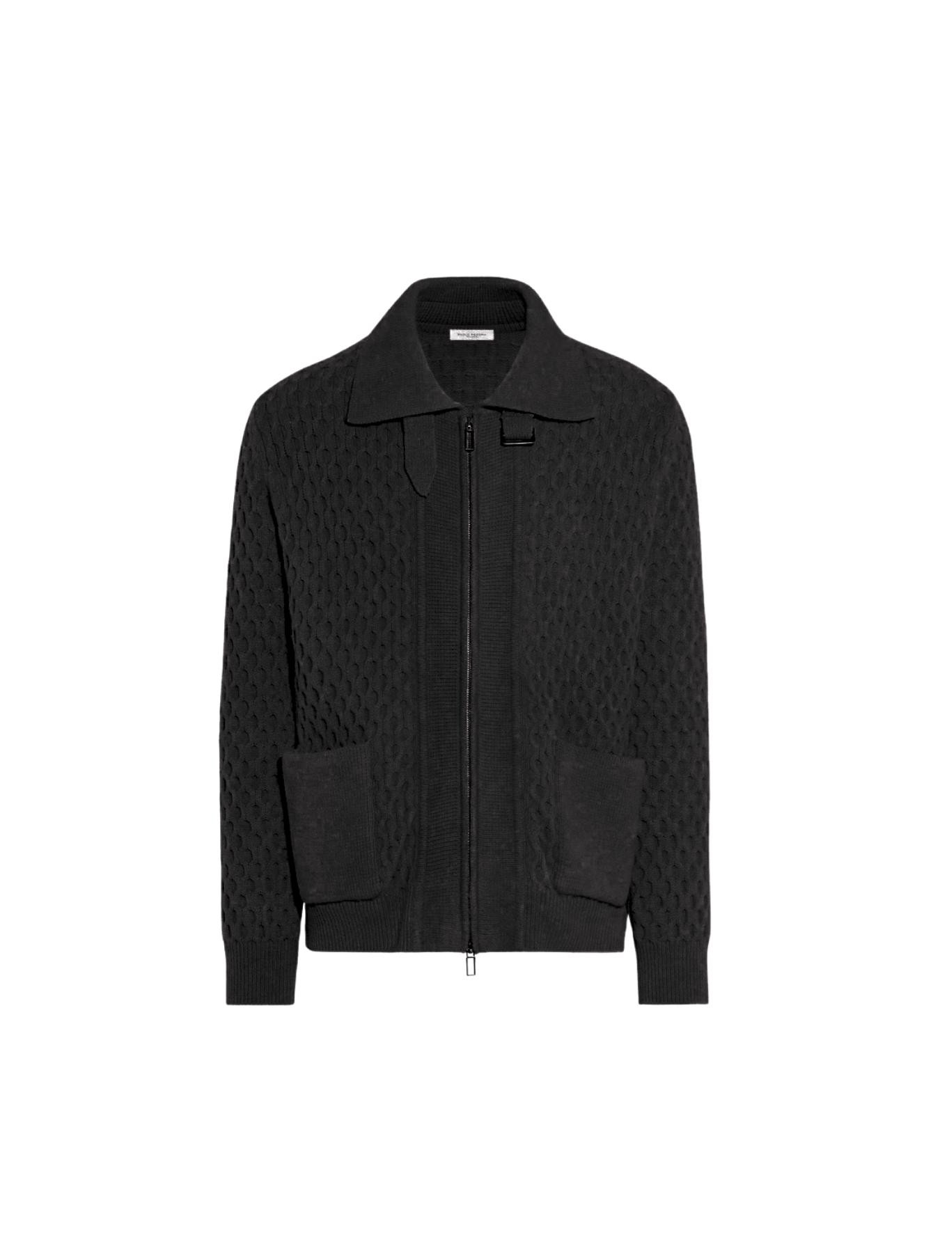 Giubbotto in maglia da uomo color nero con lavorazione a treccia, firmato Paolo Pecora Milano per la collezione Autunno Inverno 2025. Questo capo combina la struttura di un outerwear con la morbidezza e il calore della maglieria pregiata. Presenta una chiusura frontale con zip doppio cursore, ampie tasche applicate, colletto con dettaglio cinturino e una texture tridimensionale dal forte carattere. Il colore caldo e avvolgente lo rende perfetto per la stagione fredda, mentre il design ricercato aggiunge un tocco distintivo al guardaroba. Stile e qualitร Made in Italy per un capo versatile e contemporaneo.
