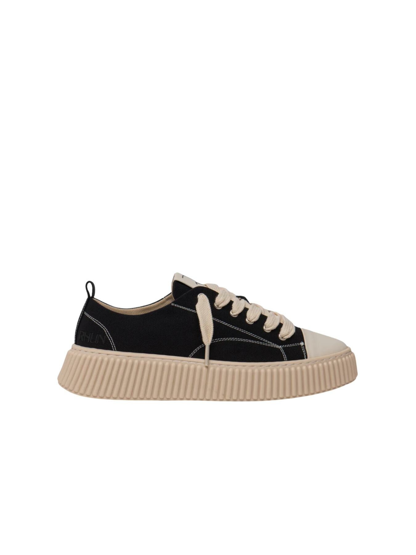 Sneakers basse realizzate in Canvas nera con cuciture bianche. Gambetto con sei passanti passanti e lacci spessi. Dotate di logo in rilievo sulla linguetta e sul tallone. Suola voluminosa in gomma beige e design con righe in rilievo.