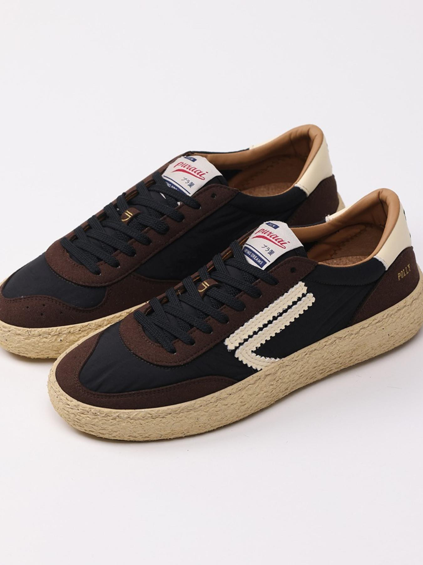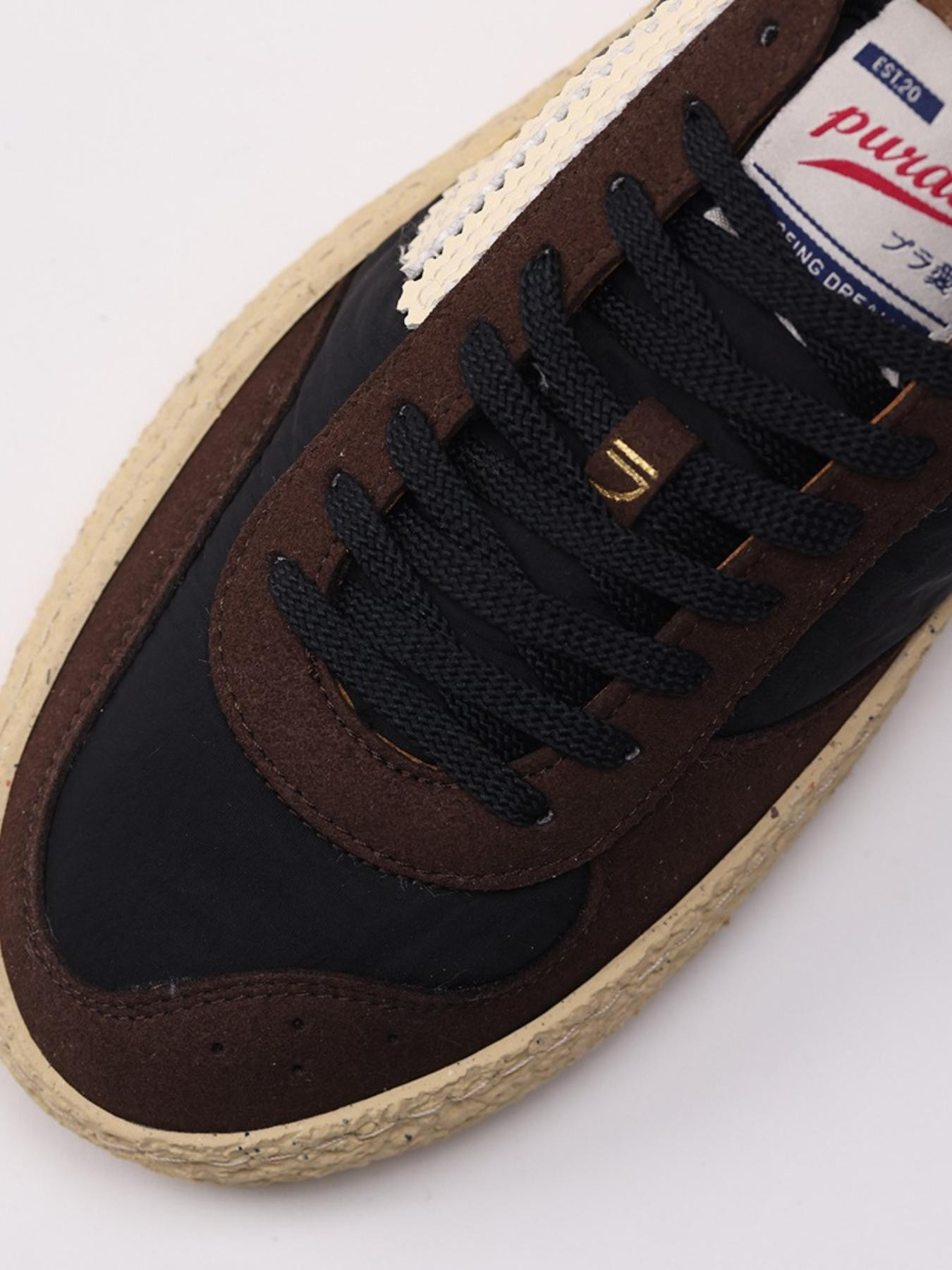 Nylon nero, microsuede marrone, logo e dettagli crema. Suola vaniglia e lacci neri