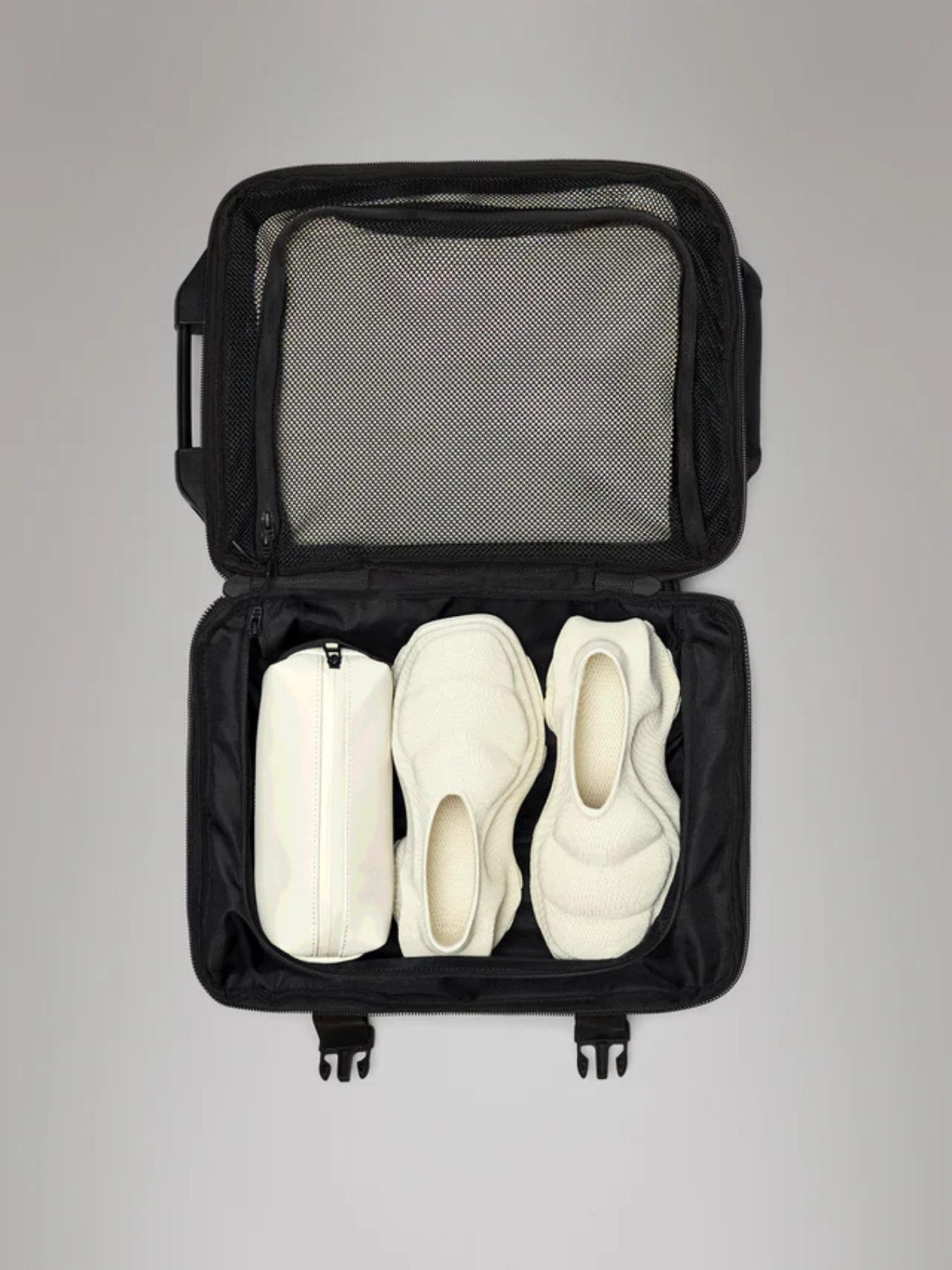 La Texel Cabin Bag Mini รจ la proposta di Rains per viaggiare leggeri. Il modello รจ realizzato nell’iconico tessuto impermeabile in PU di Rains.