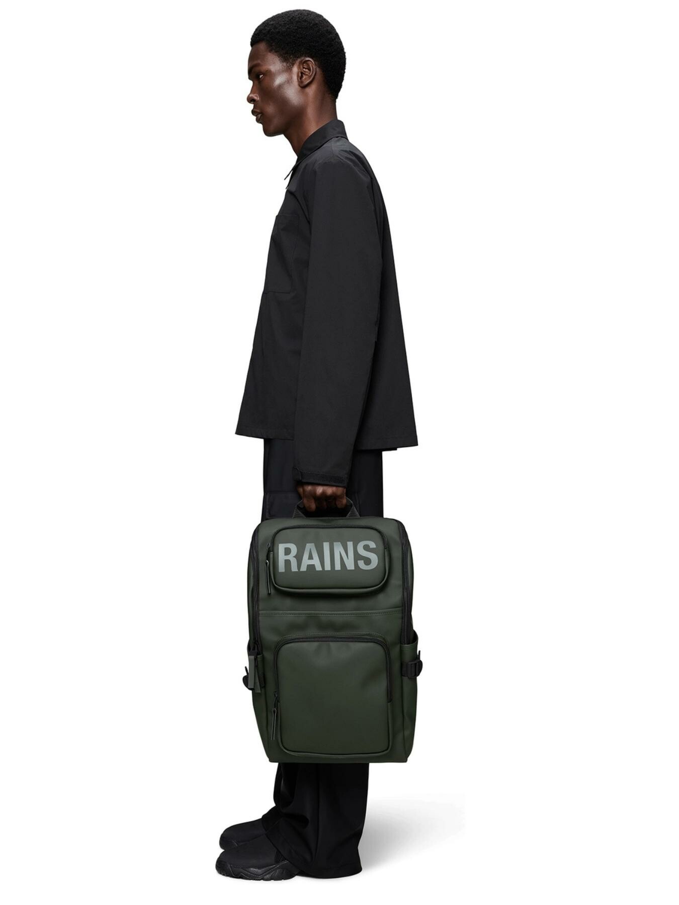 Texel Cargo Backpack รจ realizzato nel caratteristico materiale in PU impermeabile di Rains, sviluppato per garantire resistenza, durata e una finitura liscia.