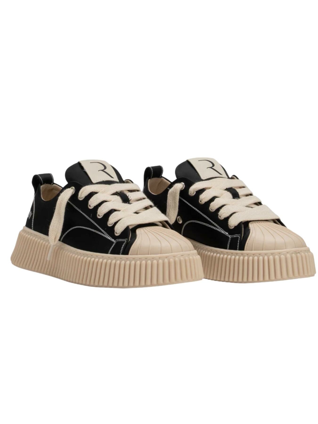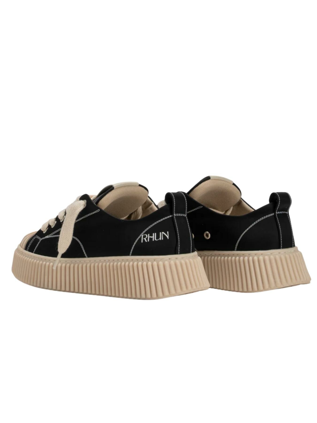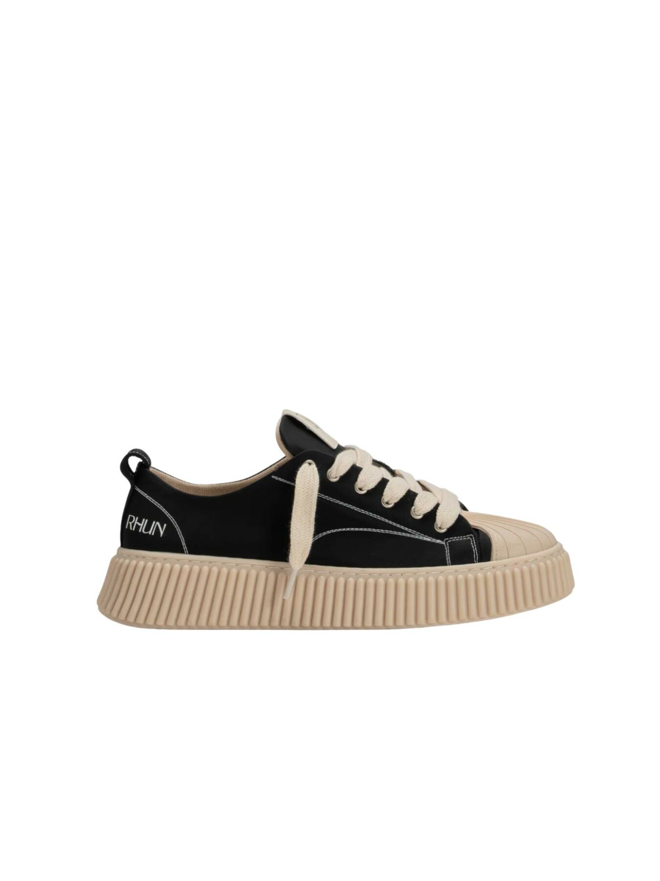 Sneakers basse realizzate in nylon nero con cuciture bianche. Gambetto con sei passanti passanti e lacci spessi. Dotate di logo in rilievo sulla linguetta e sul tallone. Suola voluminosa in gomma beige e design con righe in rilievo. Punta rinforzata con motivo a conchiglia.