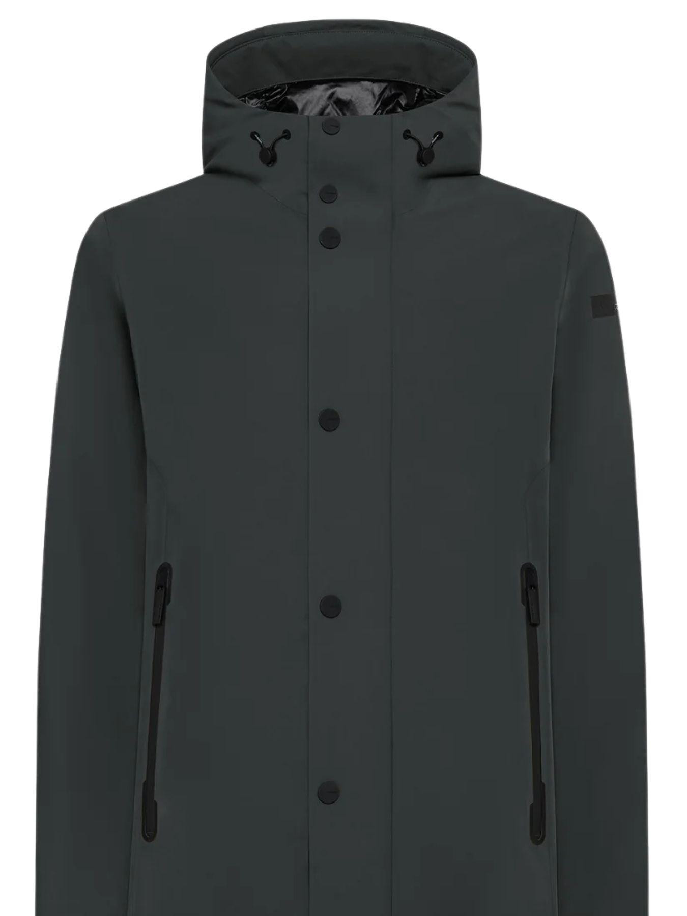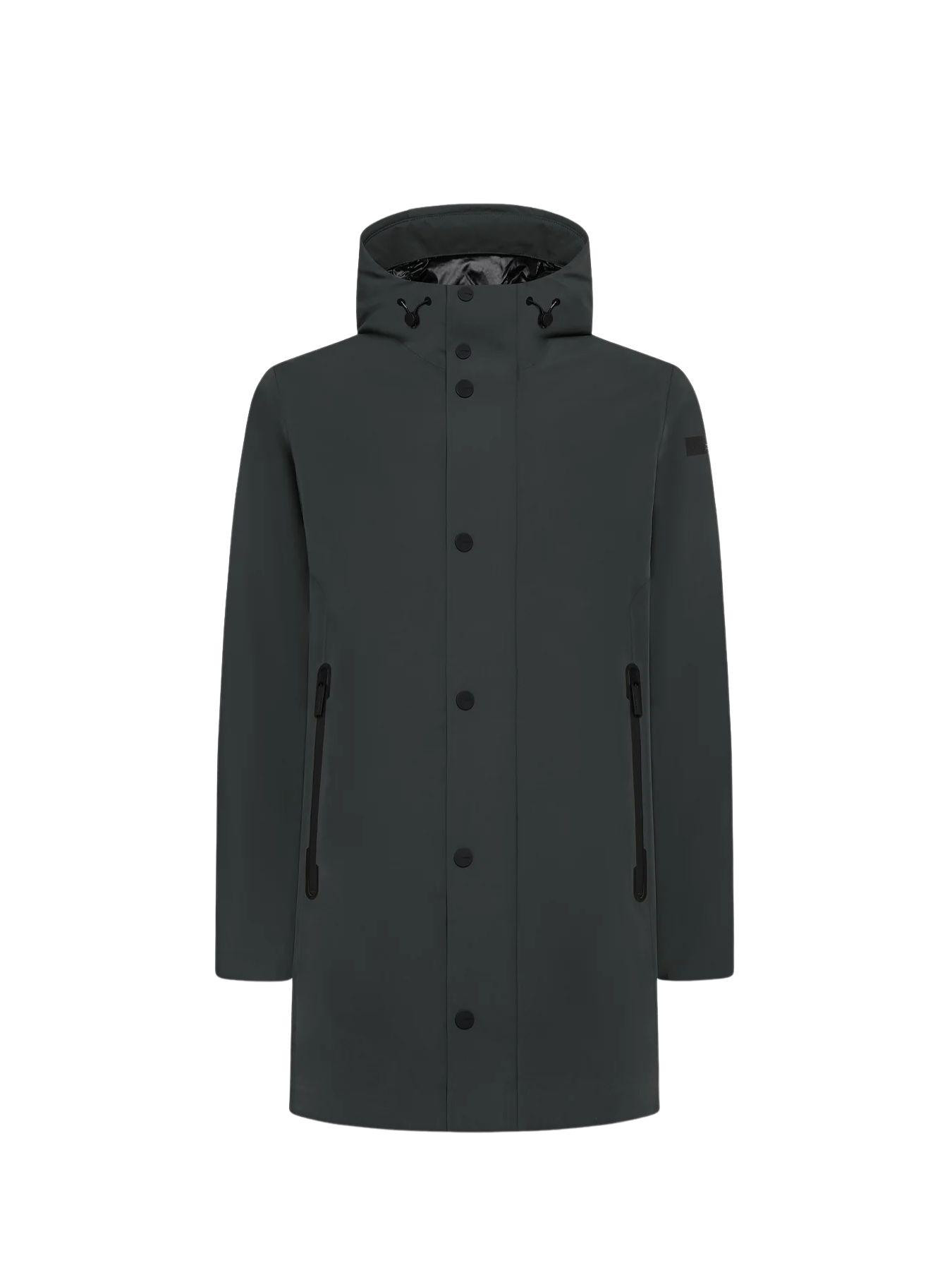 Il design minimalista, l’attenzione ai dettagli e alla scelta dei materiali distinguono l’eskimo in tessuto a membrana Stratofabric#3, traspirante e consistente. La costruzione interamente termonastrata garantisce l’impermeabilitร e la protettivitร del capospalla, dotato di cappuccio fisso regolabile con coulisse elastica. A lasciare fuori il freddo pensa l’imbottitura in piuma d’anatra 90/10, soffice e leggera, racchiusa dai canali tubici a finitura glossy. L’esclusivo sistema Floating Shield consente un fit impeccabile e un comfort impareggiabile alla vestibilitร dritta e regolare. Lo stile estremamente nitido รจ enfatizzato dal look opaco del tessuto esterno Montecristo. Vivacizzano il davanti le ampie tasche laterali termonastrate e i bottoni a pressione gommati neri. Questi ultimi chiudono la patta che nasconde la zip integrale con doppio cursore. L’interno รจ dotato di un taschino con zip invisibile, impreziosito dal doppio filetto arancione e dall’iconica tag a cuore “Made with love, designed in Tuscany”. Il logo a microiniezione nero sulla manica sinistra รจ il tocco esclusivo che completa la giacca trequarti essenziale e ricercata.