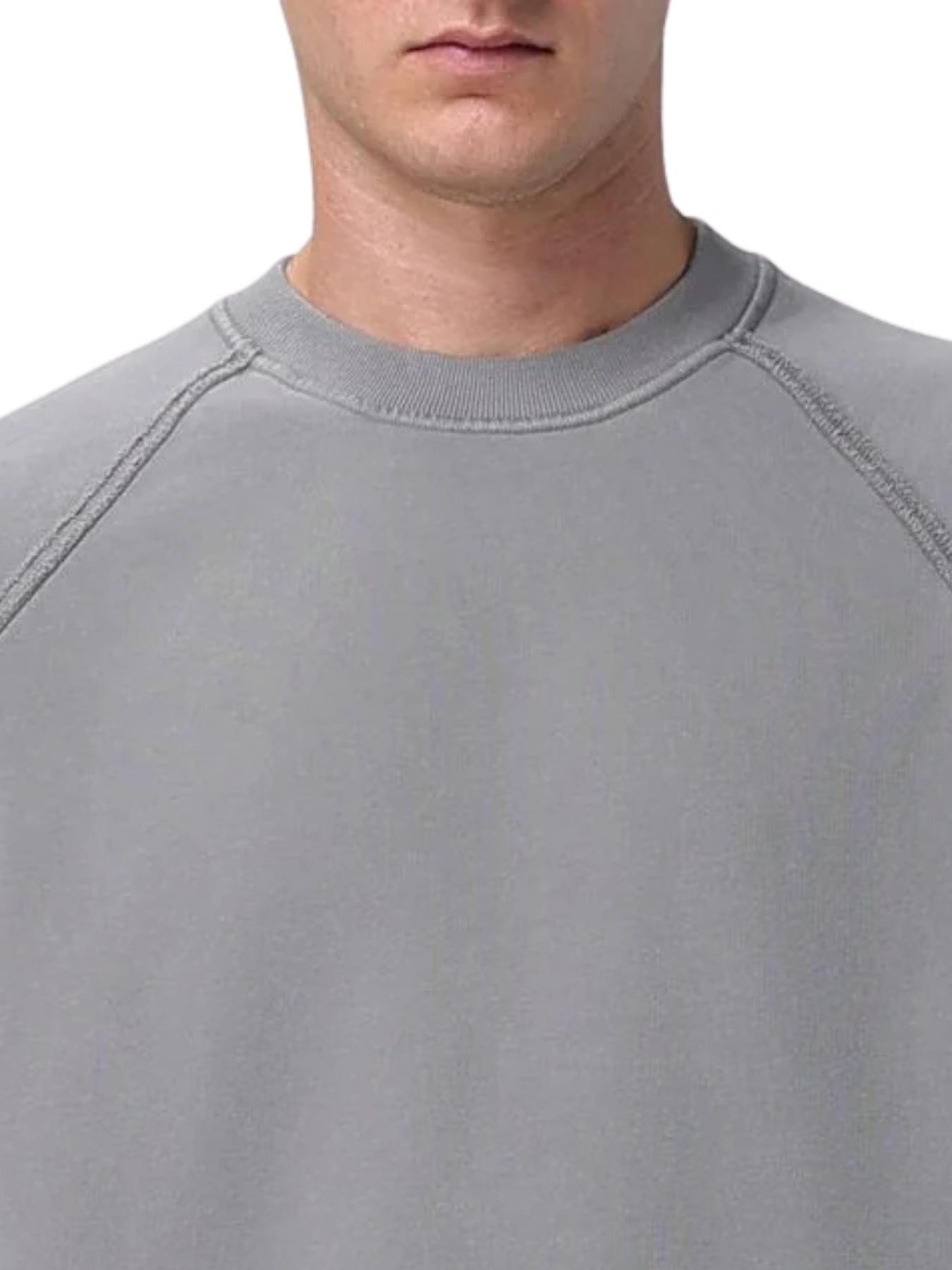 Felpa girocollo in cotone biologico garzato con maniche raglan oversize, cuciture overlock e polsini a costine elasticizzati. Modello tinto in capo.