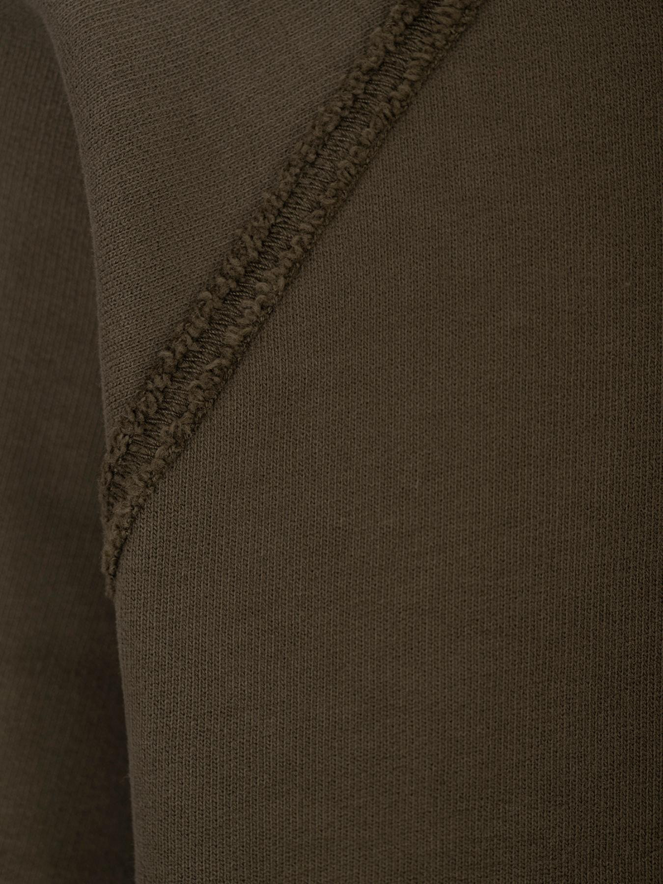 Felpa girocollo in cotone biologico garzato con maniche raglan oversize, cuciture overlock e polsini a costine elasticizzati. Modello tinto in capo