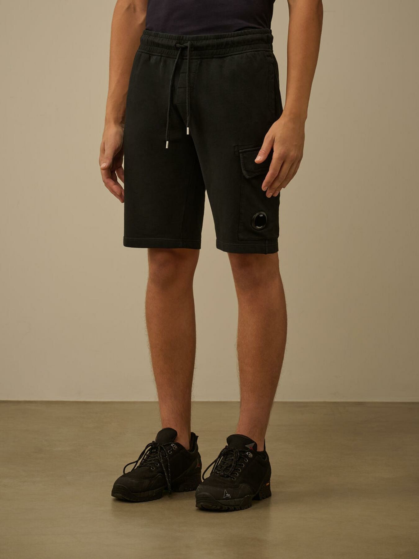 Shorts realizzati in fleece leggero garzato. Il tessuto morbido e traspirante assicura comfort e libertร di movimento. Il modello รจ completato da vita regolabile con coulisse, tasche laterali e tasca cargo con patta, bottoni automatici e l’iconica Lente di C.P. Company. Tinti in capo. Regular fit.