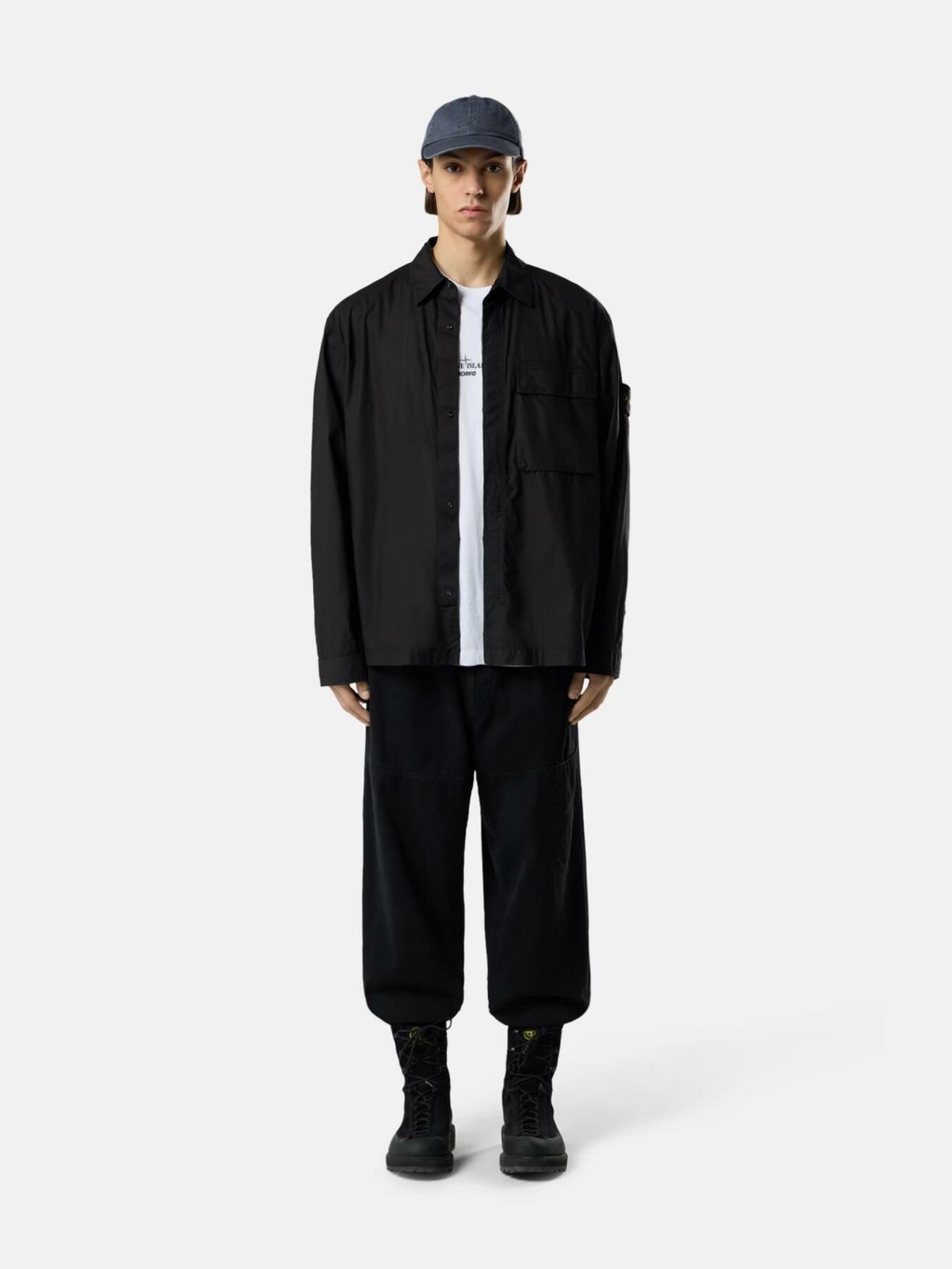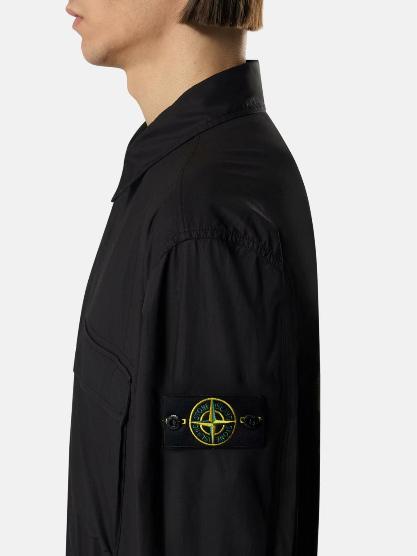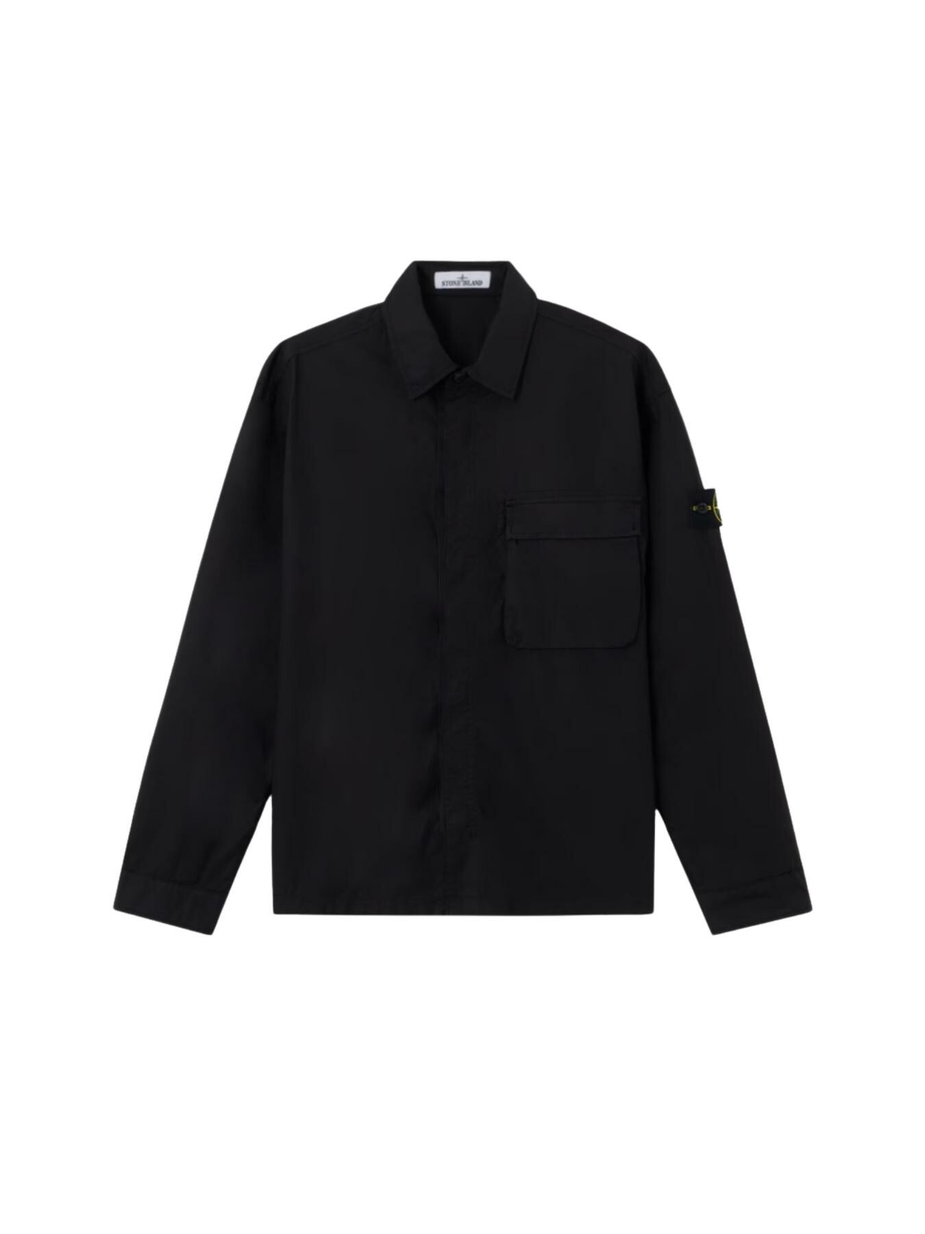 Collo con automatico. Tasca a soffietto sul petto con patta e due bottoni automatici nascosti. Badge Stone Island sulla manica sinistra. Polsini con bottone automatico. Chiusura con bottoni automatici su bordo con nastro sotto la finta. Vestibilitร comfort