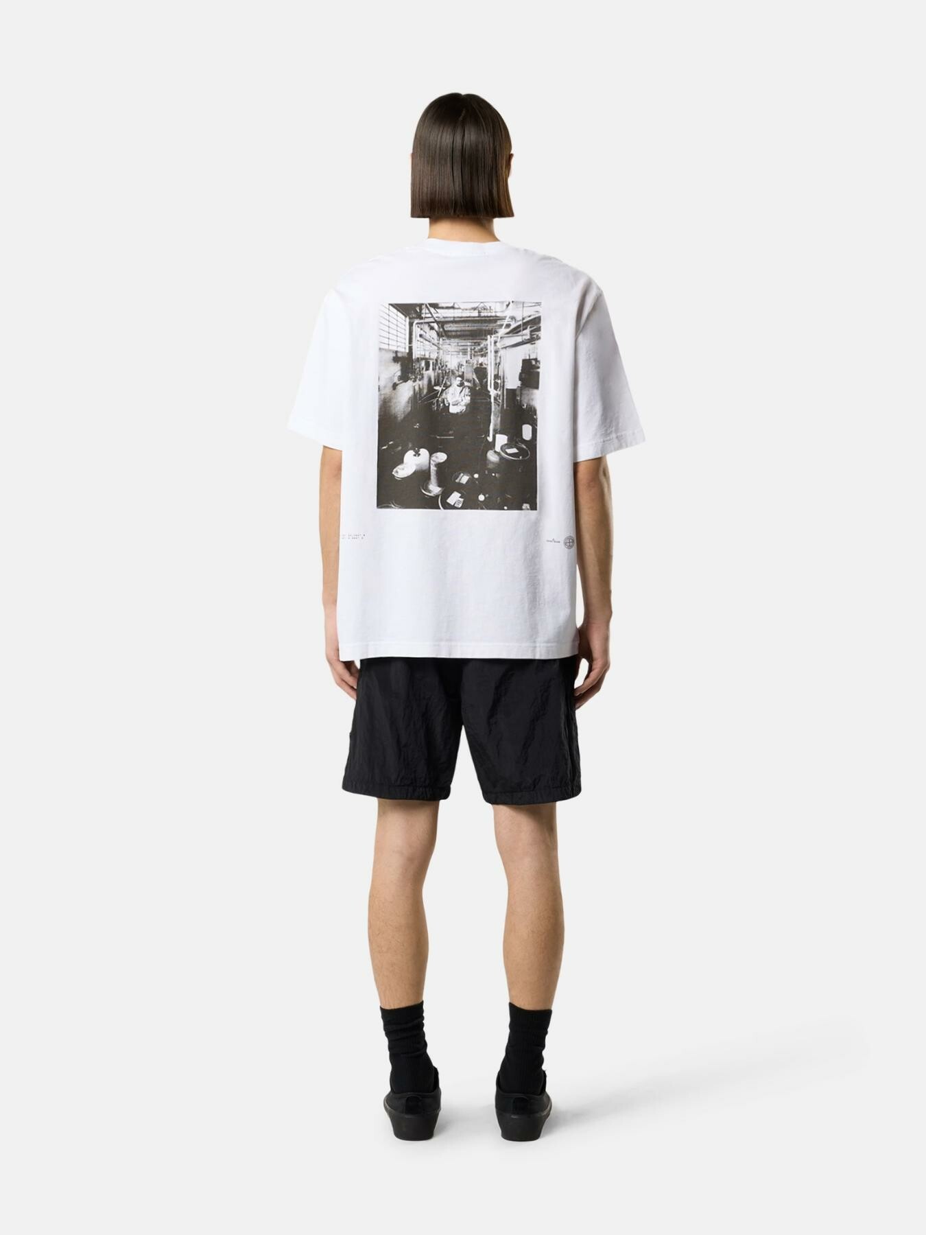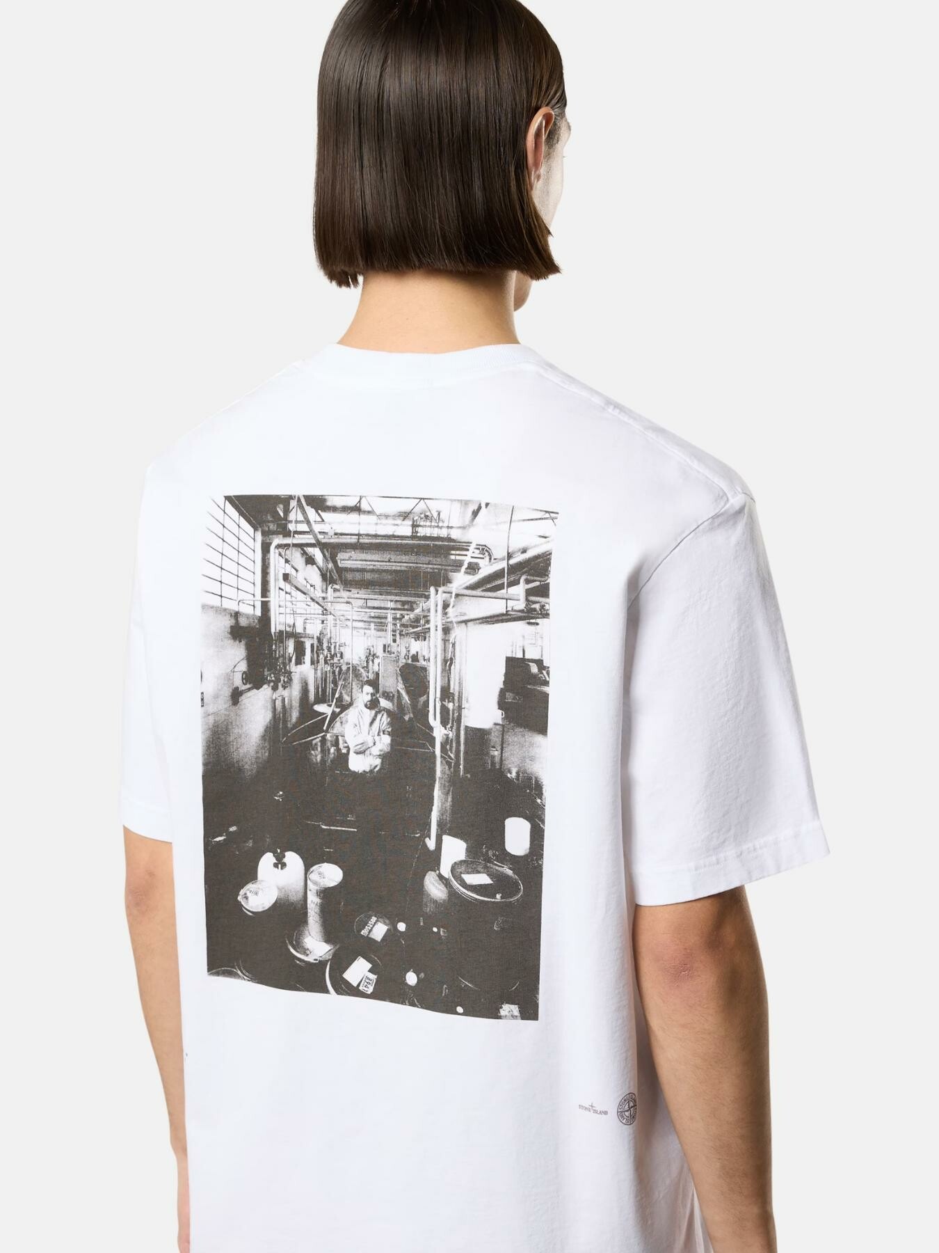 T-shirt a manica corta in jersey di cotone biologico pettinato con stampa logo sul petto e una grande stampa sul retro che ritrae Carlo Rivetti allo Stone Island Colour Laboratory nel 1993. Modello tinto in capo.