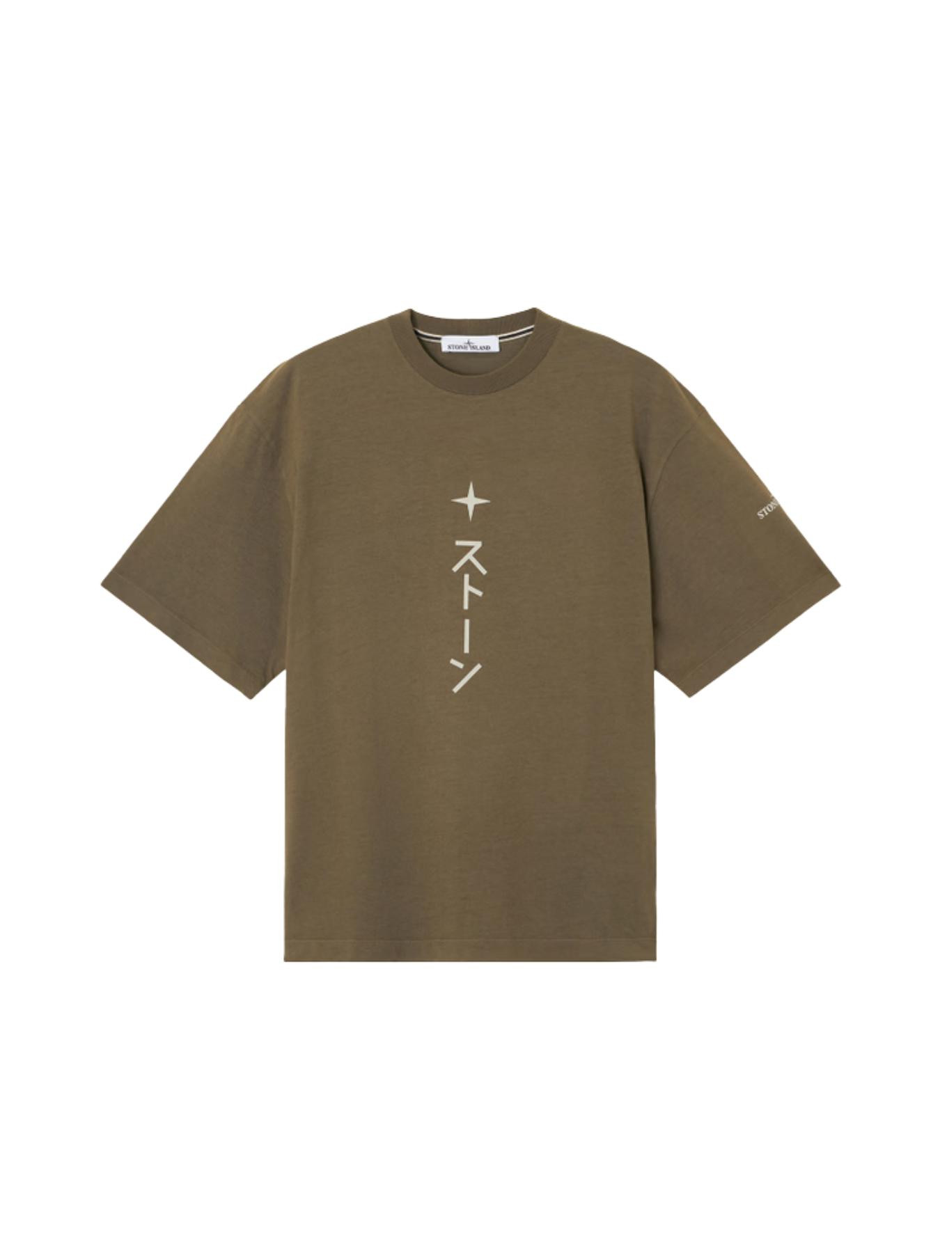 T-shirt a manica corta in jersey di cotone biologico pettinato, con la stella Stone Island e caratteri giapponesi davanti e dietro. Modello tinto in capo.