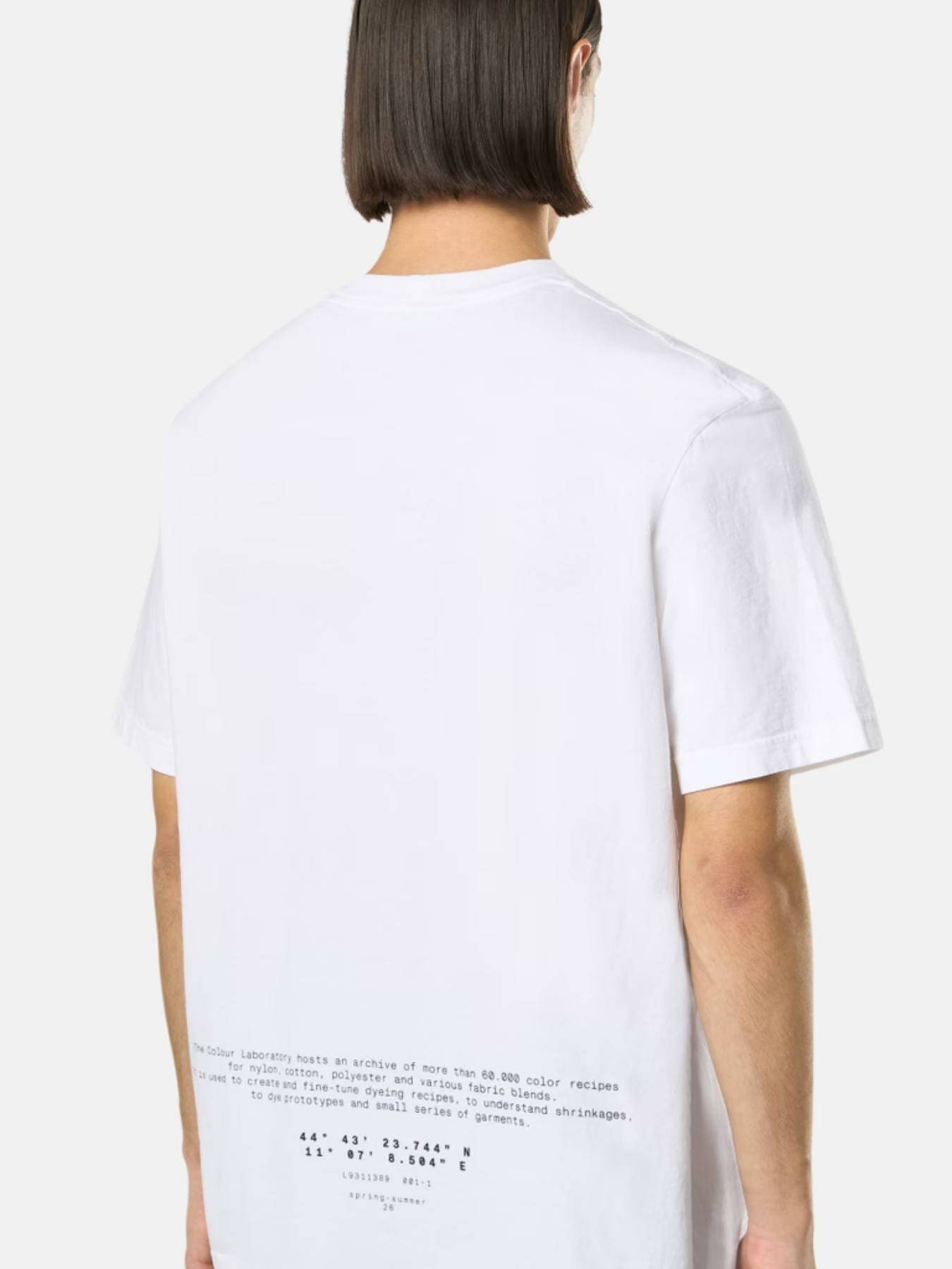 T-shirt a manica corta in jersey di cotone biologico con stampa logo Compass sul petto e scritta sul retro che richiama lo Stone Island Colour Laboratory. Modello tinto in capo.